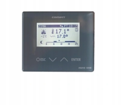 nano One Room Panel - - это мирное термостат, сотрудничающий с регуляторами установки. Вы можете установить на него удаленную температуру, ECO, температуру в программе за пределами дома (отпуск). Переключение между удобной температурой и эко и зоной за пределами дома проводится автоматически с использованием запрограммированного ежедневного и еженедельного графика. Кроме того, у термостата есть график для государственных праздников и ручного рабочего режима.