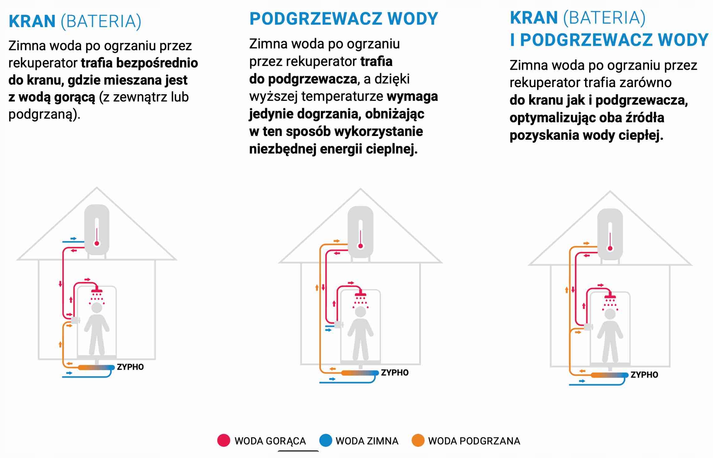 Рекуператоры воды будут хорошо работать везде, где мы регулярно используем горячую воду. В зависимости от назначения - семейное домохозяйство или рабочее место или спортзал, принимая во внимание гораздо большее количество пользователей, мы должны выбирать модель, адаптированную к нашим индивидуальным потребностям.