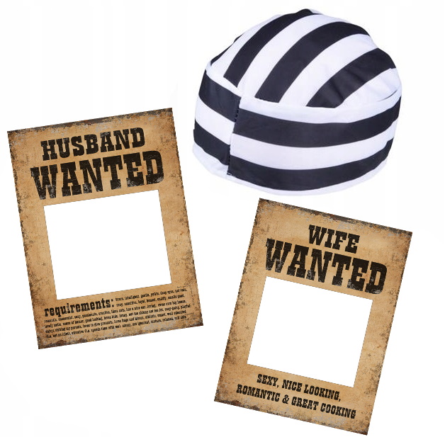 - Картонные таблички для фотографий «Разыскивается муж» и «Разыскивается жена», размеры 32х24 сантиметра.