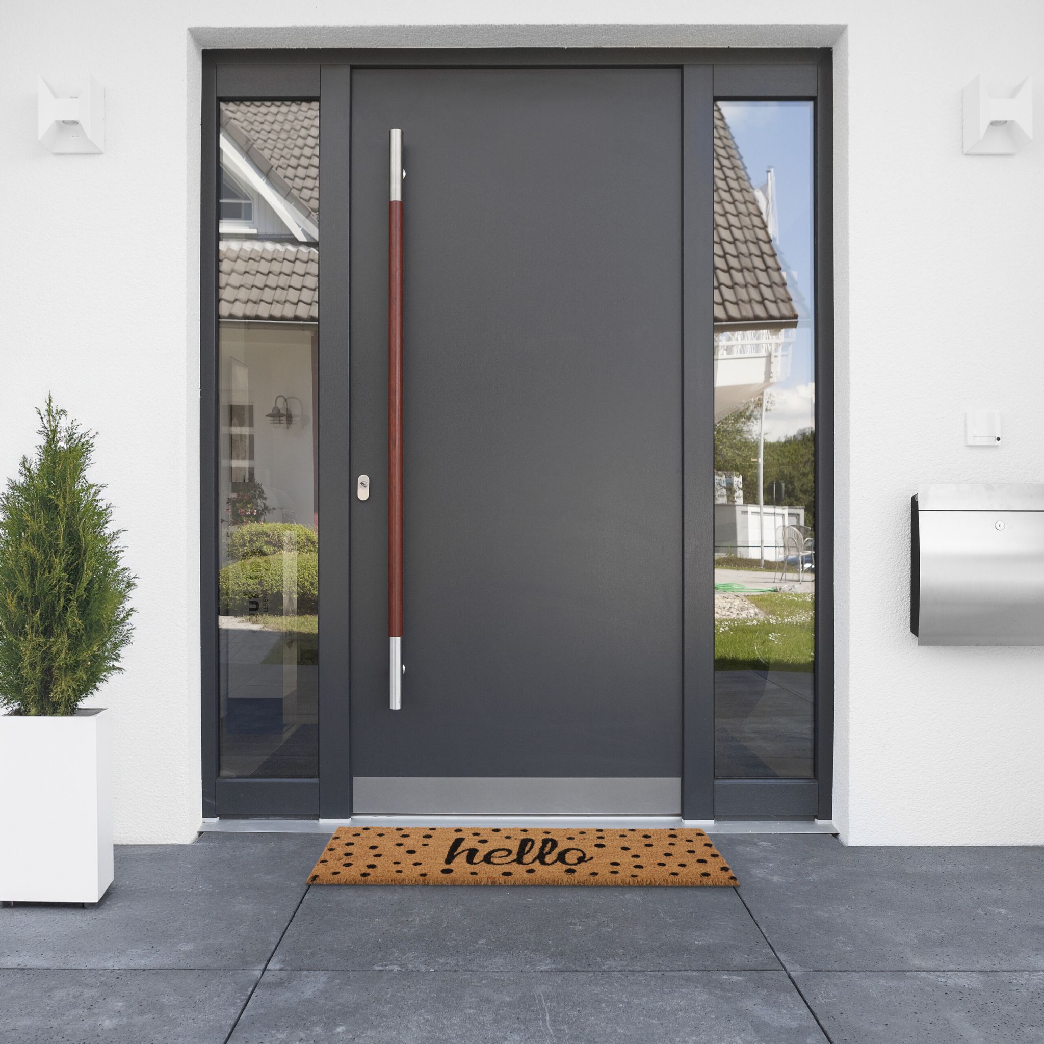 Благодаря этому кокосовому коврику с дружелюбной надписью «Привет» и очаровательными точками каждый гость почувствует себя желанным гостем прямо с порога вашего дома. Благодаря натуральным волокнам кокоса коврик прочный и устойчивый к погодным условиям, его можно использовать как в помещении, так и на открытом воздухе. Он отлично подойдет не только у двери квартиры, но и у главного входа в дом или на террасе. Нижняя часть коврика защищена нескользящим материалом ПВХ, благодаря чему он остается на месте.