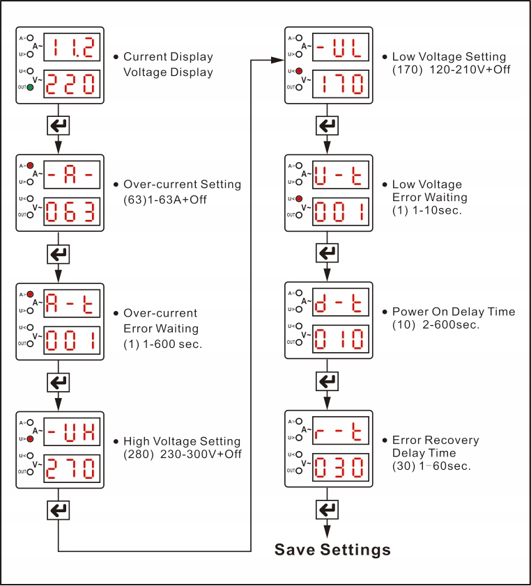 Выход из состояния ошибки выходного напряжения: когда сетевое (входное) напряжение возвращается в норму/когда оно достигает значения между установленными значениями высокого и низкого напряжения, устройство ожидает заданное время ожидания для сброса, а затем устройство восстанавливает питание, светодиод ошибки гаснет, светодиод OUT загорается.
