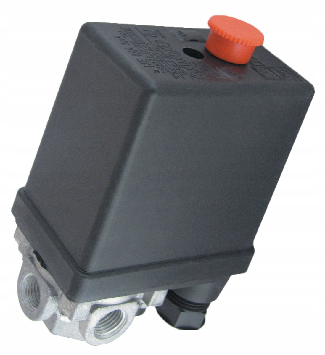 Реле давления, реле давления NEMA, предназначенное для компрессоров 230 В. Заводская настройка: точка включения 6 бар и точка выключения 8 бар. Точку отключения можно регулировать, сохраняя разницу в 2 бар. Коммутатор имеет внутренние силовые соединения с резьбой 1/4 дюйма снизу и боковые соединения 3 1/4 дюйма. Боковые соединения обычно используются для монтажа аксессуаров (манометра, предохранительного клапана, быстроразъемных соединений или просто заглушаются заглушкой)