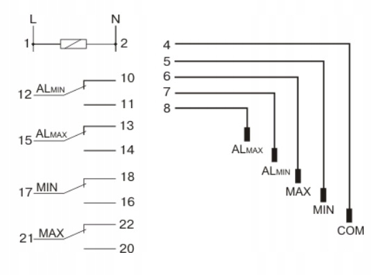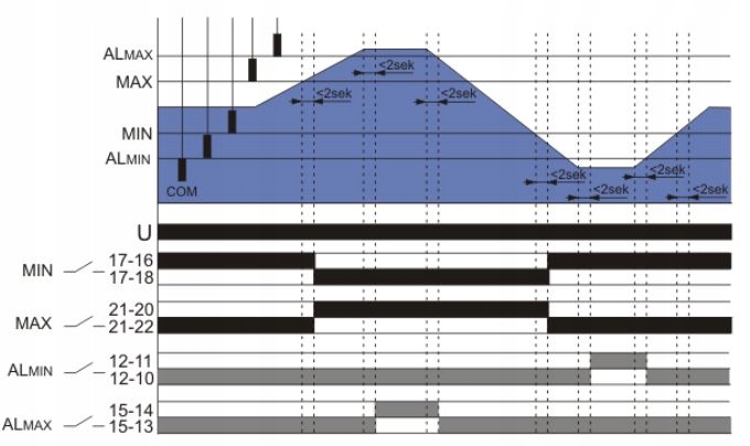 Реле поддерживает уровень контролируемой жидкости в пределах заданного минимального и максимального состояний. После того, как уровень жидкости опустится до состояния MIN (электроды MIN и COM разомкнуты), контакт MIN переключится в положение 17-16 (операция ЗАПОЛНЕНИЕ), а контакт MAX останется в положении 21-22. После достижения состояния MAX (электроды MAX и COM закорочены) контакт реле MIN переключается в положение 17-18 (операция СЛИВ), а контакт MAX в положение 21-20. Состояние сигнализации: ALMIN (состояние СУХОЙ РАБОТА) - после падения уровня жидкости до уровня ALMIN (электроды ALMIN и COM разомкнуты) контакт ALMIN переключится в положение 12-11; ALMAX (состояние ПЕРЕПОЛНЕНИЯ) - после достижения состояния ALMAX (электроды ALMAX и COM закорочены) контакт реле ALMAX переключается в положение 15-14. Каждое состояние, т.е. соответствующий датчик уровня и датчик COM закорочены, сигнализируется соответствующим светодиодом на передней панели реле. Желтый светодиод MIN загорается, указывая на рабочее состояние ЗАПОЛНЕНИЕ.