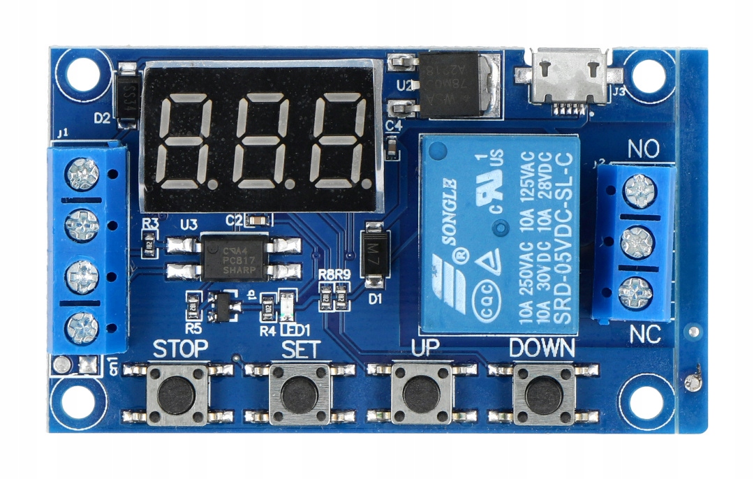 Модуль оснащен реле SRD-05 с катушкой, питаемой напряжением 5 В. Система позволяет управлять исполнительными устройствами с помощью портов микроконтроллера или любого комплекта отладки. Реле оснащено системой задержки, работающей в диапазоне от 0,1 с до 999 мин, позволяющей осуществлять задержки включения, выключения, циклическую работу и работу с удержанием.