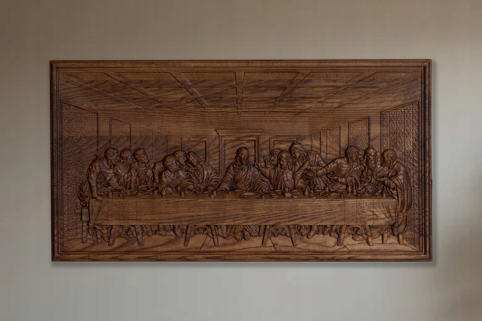 Декоративный барельеф с изображением Тайной вечери размером 100 × 50 см, выполненный из дерева ясеня, представляет собой изящный декоративный элемент, обладающий неповторимым характером. Тщательно воспроизведенные детали придают сцене глубину и реалистичность, подчеркивая мастерство ручной работы. Естественная структура древесины и точная обработка делают каждое изделие уникальным.