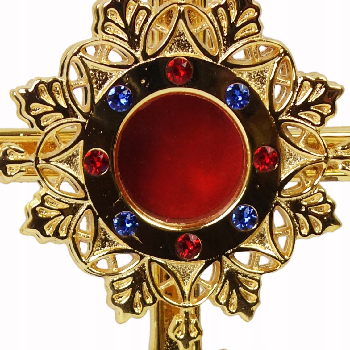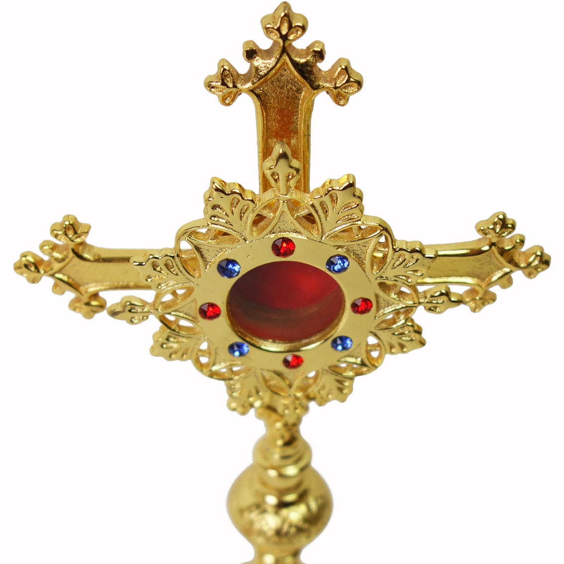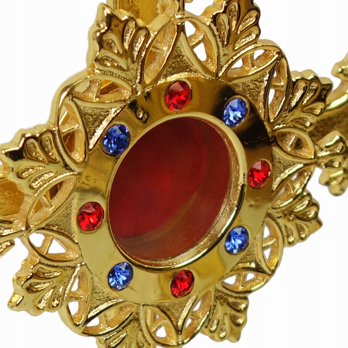 Реликварий в форме креста является элегантным и духовно значимым литургическим объектом, изготовленным из латуни и золота, что придает ему уникальный вид и долговечность. Это идеальный объект для хранения и демонстрации реликвий святых в церквях, часовнях и других местах поклонения.