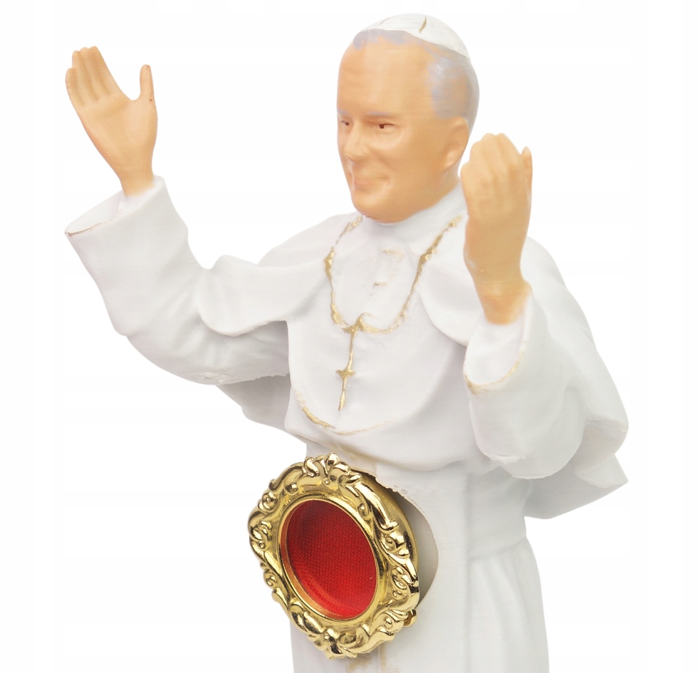 Предлагаем реликварий в фигурной форме, представляющий фигуру Святого. Иоанн Павел II. Фигурка Святого Иоанн Павел II был изготовлен с использованием технологии 3D-печати. Традиционная позолоченная Луна. Папский реликварий — уникальный религиозный объект, который символически отдает дань уважения одному из самых важных пап в истории католической церкви. На статуэтке изображен Папа Иоанн Павел II в белой рясе, которая является характерным элементом его понтификата. На палантине размещен герб Ватикана, что добавляет репрезентативности и подчеркивает связь между Папой Римским и резиденцией Святого Престола.
