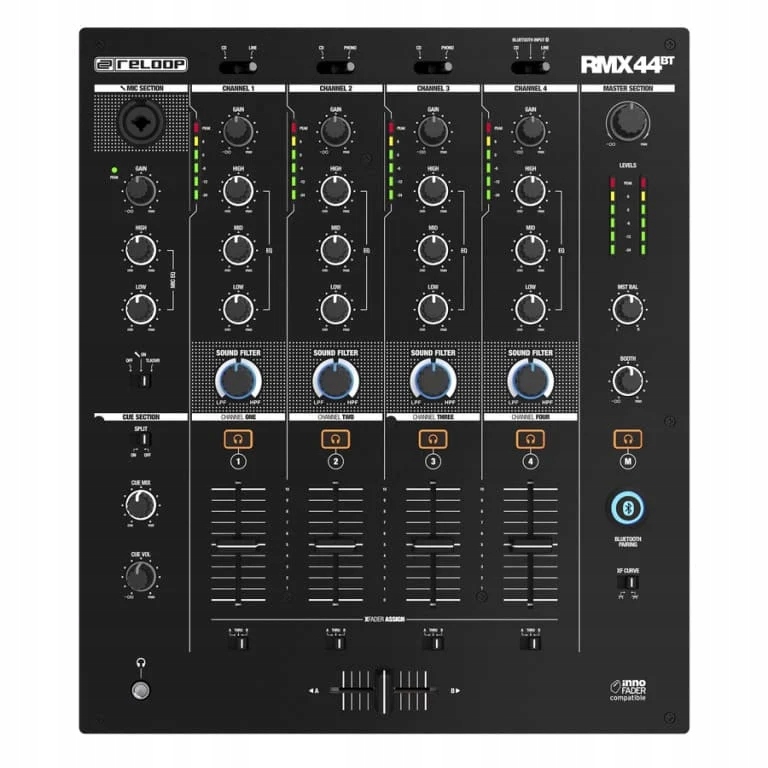 Reloop RMX-44 BT — это 4-канальный клубный Bluetooth-микшер с классическим внешним видом, включающий Bluetooth-вход с функцией Cue, который предлагает множество возможностей использования. Интуитивно понятная компоновка Club Mixer обеспечивает простой обзор и позволяет опытным артистам сразу сориентироваться.