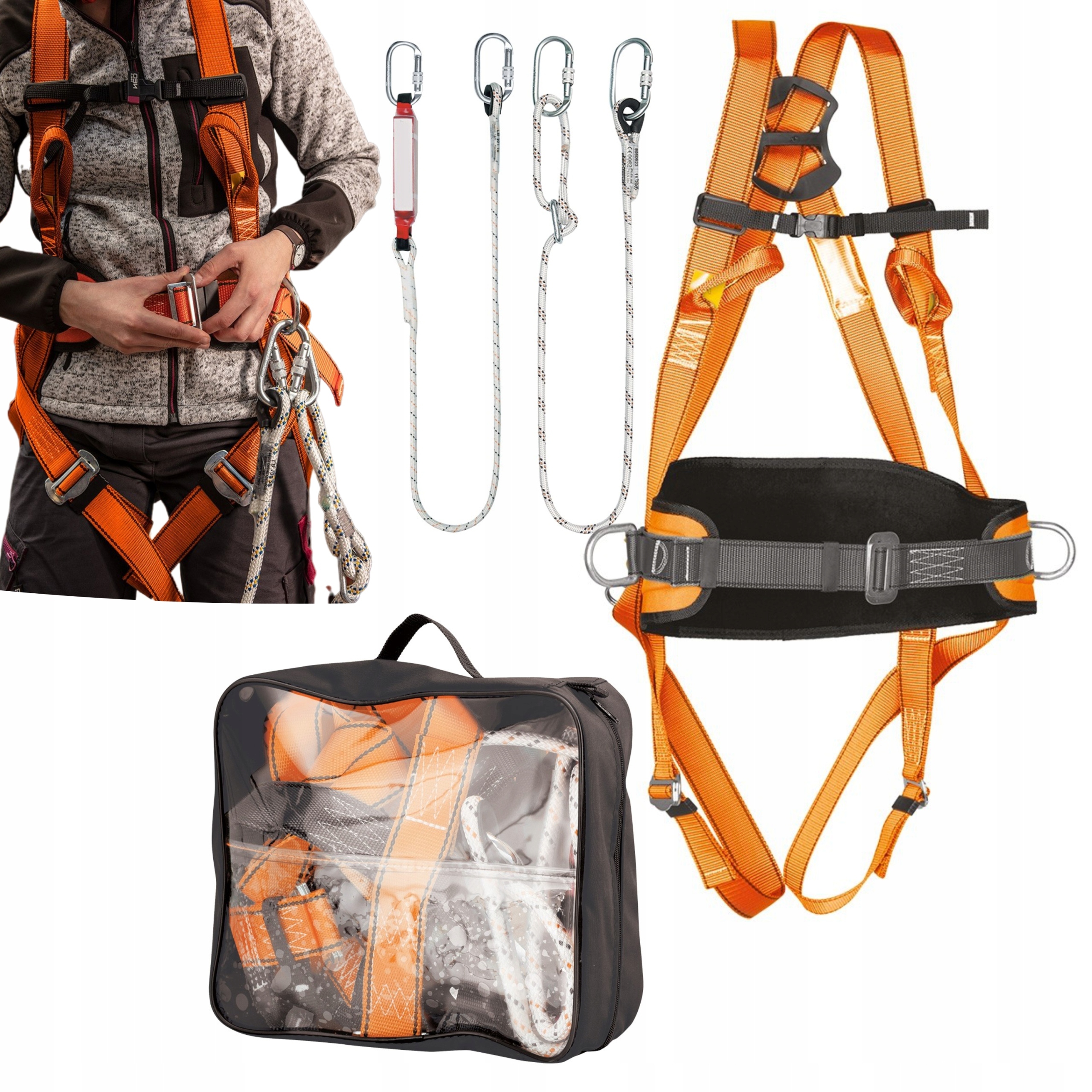 Страховой комплект с поясным ремнем и амортизатором 97-102 фирмы NEO предназначен для работы на высоте с опорой. Он состоит, среди прочего: с ремнями безопасности P 05 из прочного полиэстера, с передними и задними точками крепления, а также ремнем и боковыми пряжками, размеры M-XL. Пряжки застегивания и регулировки, регулировочные пряжки, ручные пряжки, пряжки-фиксаторы и нагрудные пряжки помогают подогнать изделие под структуру тела и правильно распределить силу давления при падении. В комплект также входит безопасный амортизатор ABM с тросом LB 101, регулируемый трос LB 100 длиной 2 м со стальными карабинами AZ 011 и практичная сумка для транспортировки. Продукт рекомендуется как незаменимый продукт для профессий, требующих выполнения задач в условиях повышенного риска, особенно для работ на деревьях, столбах или строительных конструкциях.