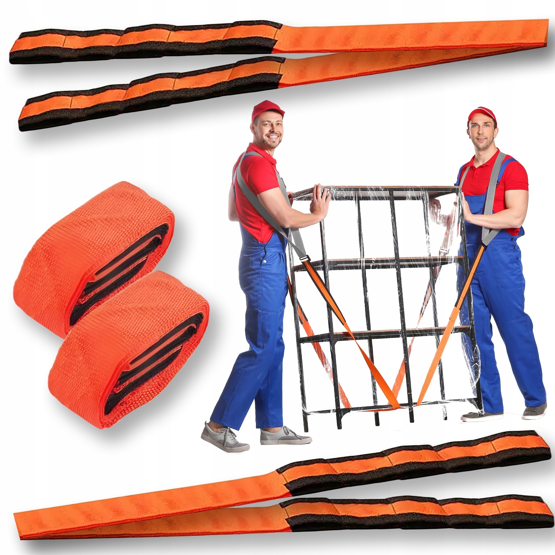 Транспортные ремни, чтобы облегчить передачу крупных предметов. Благодаря этим полосам, вы можете легко переместить диван в другую комнату, поднять шкаф вверх по лестнице в квартиру или взять его. Сделано из высокого пластика. У них есть возможность регулировать длину. Длина ремня составляет около 235 см, оранжевые. Набор включает в себя два часа ремня