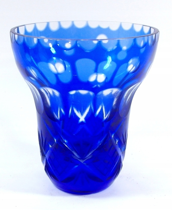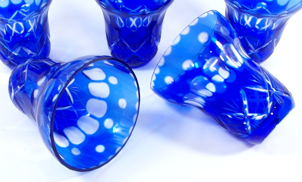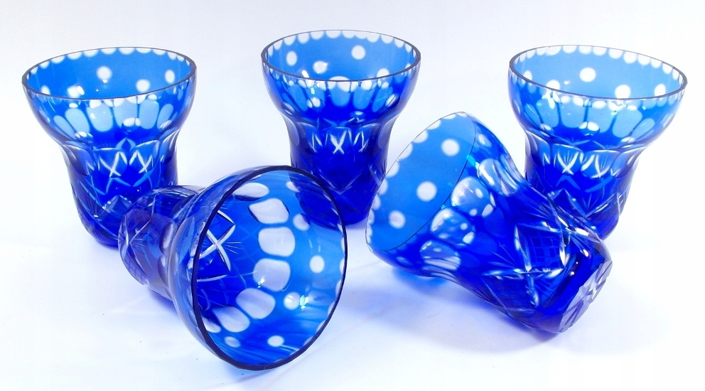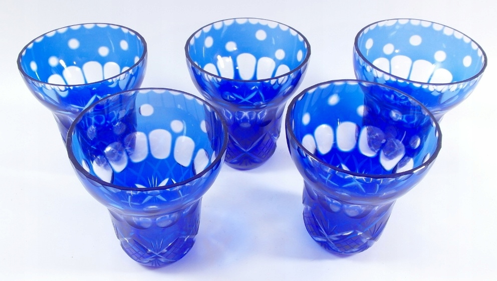 Красивый, старинныйнабор из 5 стаканов ремер,из синего и бесцветного многослойного хрусталя.