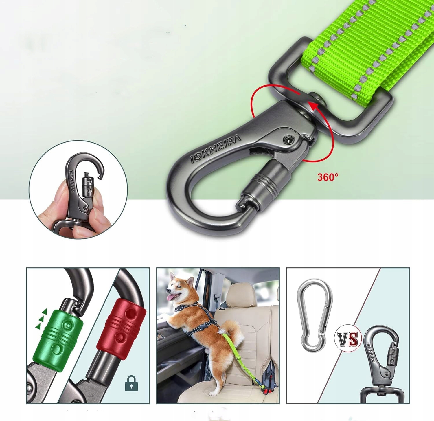 ✅ Запираемый карабин изготовлен из легкого, но чрезвычайно прочного сплава, выдерживающего усилие до 80 килограмм. Поворотная конструкция на 360° предотвращает перекручивание поводка и обеспечивает собаке свободу передвижения в автомобиле.