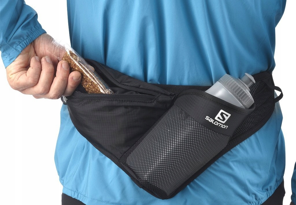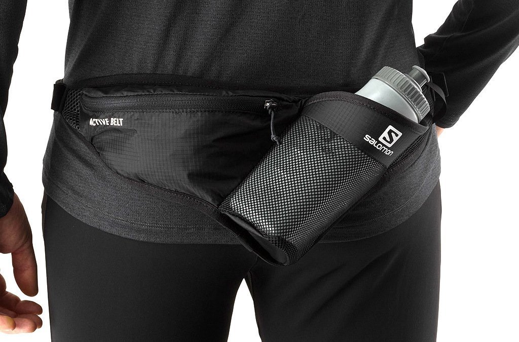SALOMON ACTIVE BELT — беговой ремень на бедрах с пришитым карманом для бутылки с водой. под углом 45 градусов и с дополнительным карманом для мелочей. Обеспечивает комфорт и легкий доступ к содержимому во время умеренно длинных пробежек.
