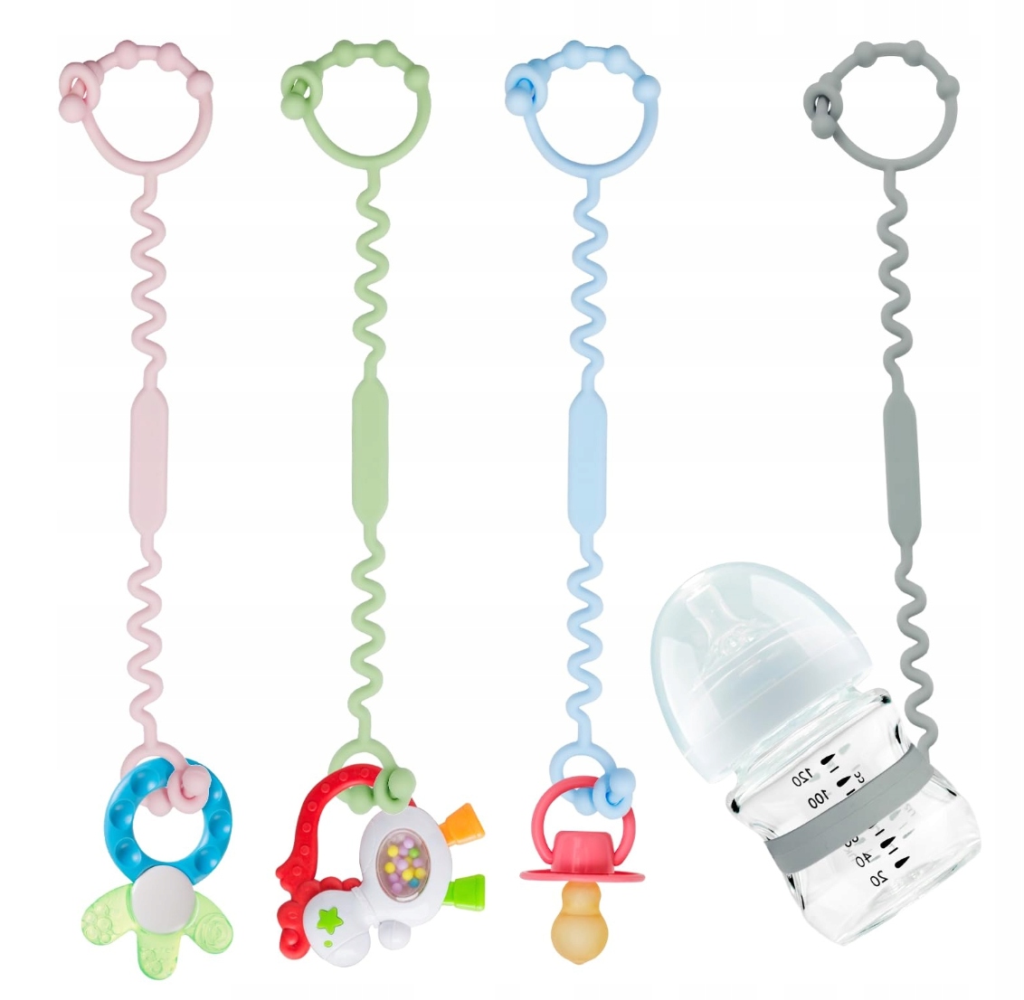 Вы можете привязать любимые игрушки вашего ребенка или прорезыватели, соски, чашки к одному концу цепочки, а другой конец прикрепить к запястью ребенка. или коляска, автокресло, стульчик для кормления или коляска, люлька.