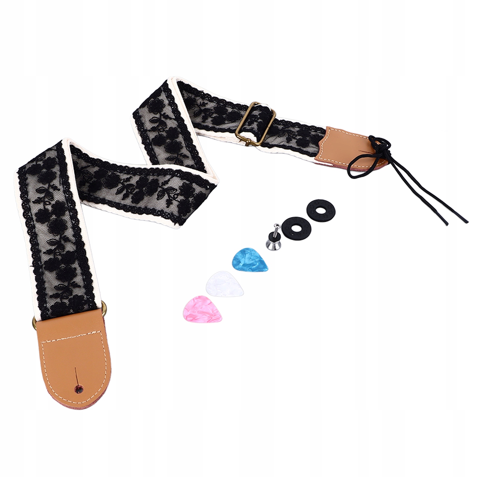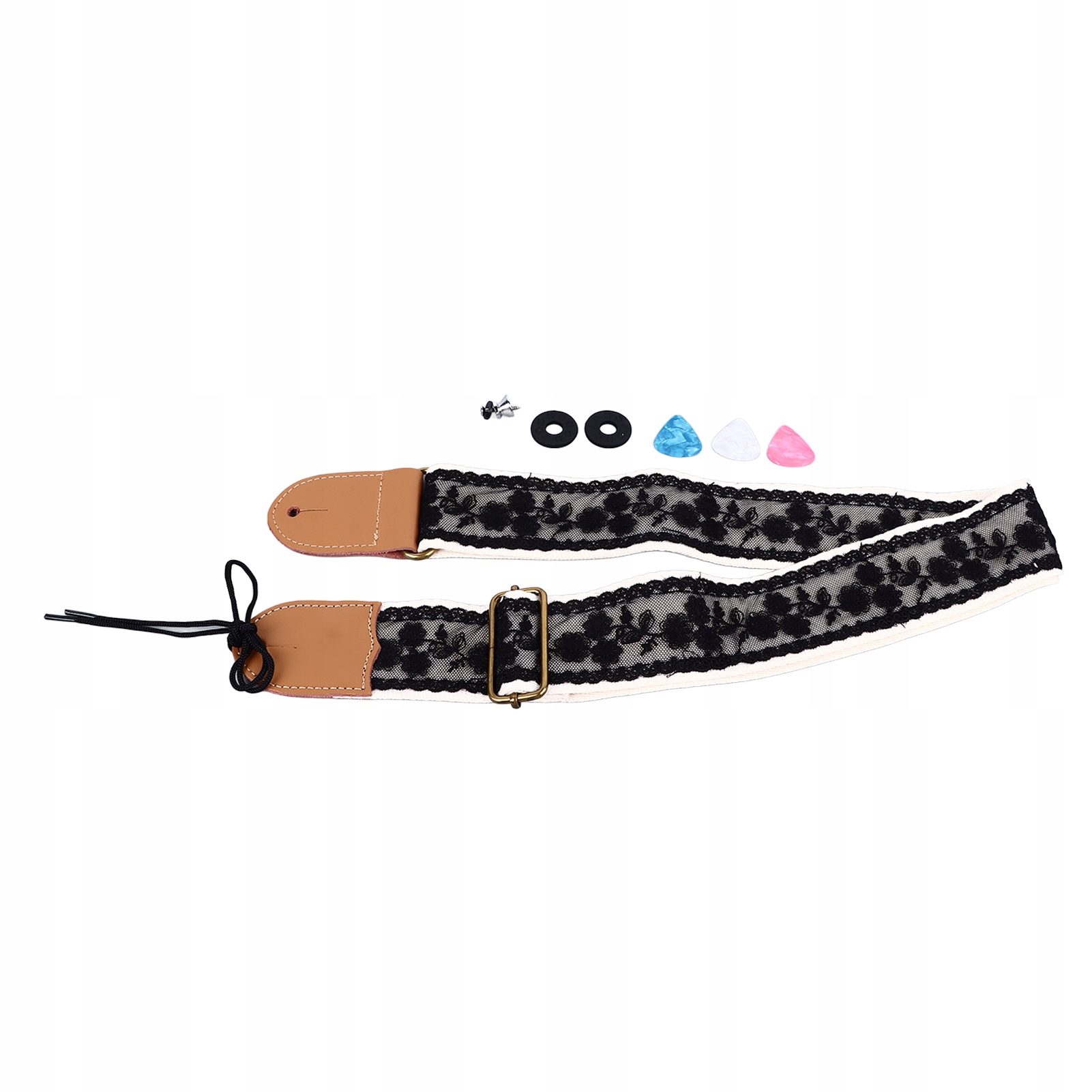 1. ДИЗАЙН ЧЕРНОГО КРУЖЕВА: черное кружево и вышитый узор делают ремешок для гитары более изысканным и модным, подчеркивая вашу индивидуальность и стиль.