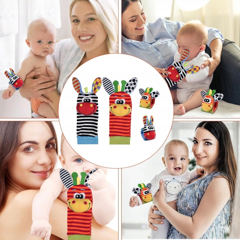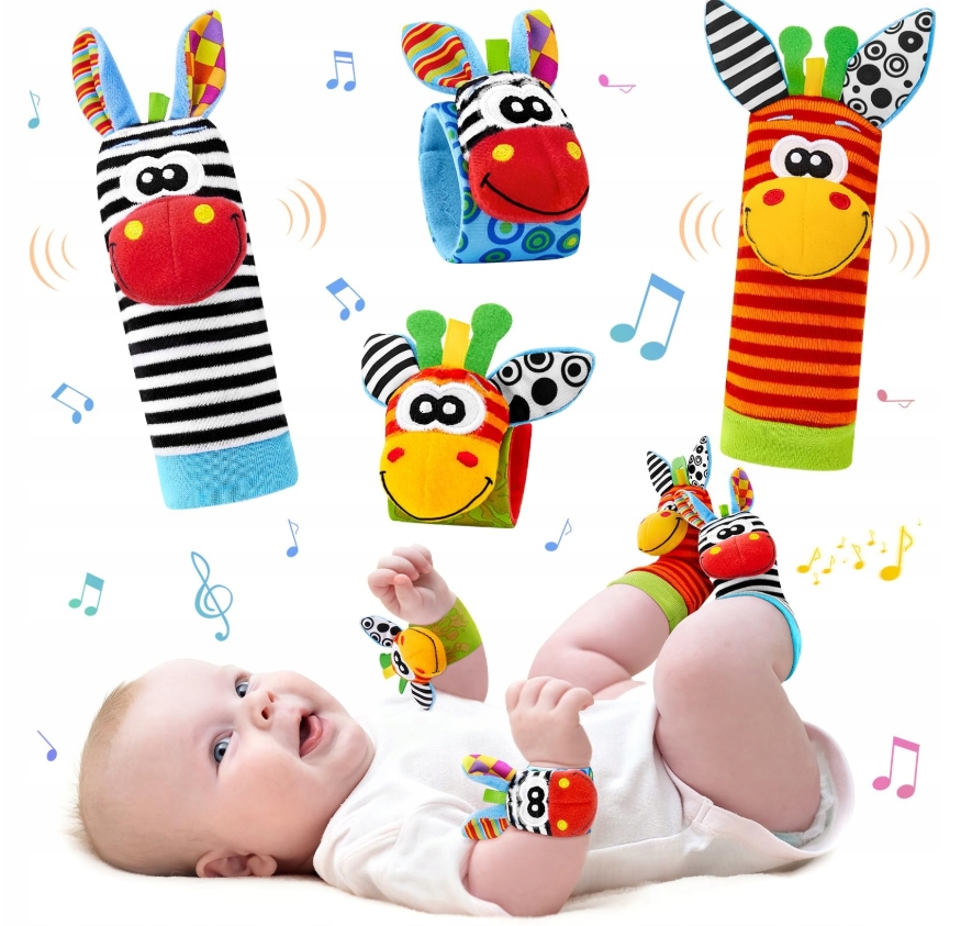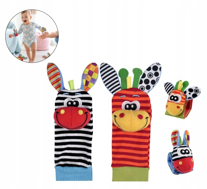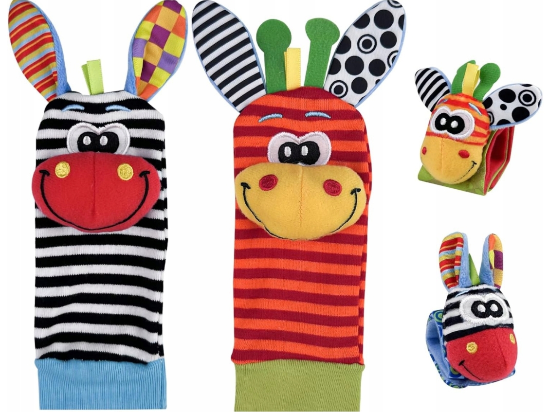 В этот детский набор с изображением жирафа входят погремушка на запястье и носки, изготовленные из экологически чистых материалов, а также встроенные колокольчики безопасности.