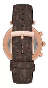 Оригинальныйремешок для часов Michel Kors для модели MK6917, из коричневой прорезиненной кожи с логотипом Michael Kors, профилированным к корпусу часов, застежка из нержавеющей стали розового золота с надписью Michael Kors.