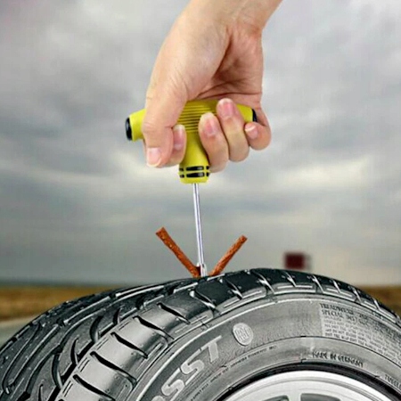 3. Нанесите прикрепленный клей на веревку, это ускорит процесс вулканизации. Затем проденьте веревку через шило и плотно вставьте шило в отверстие после прокалывания, мин. 2/3 длины корда необходимо уложить в шину. Движение совершайте согласно углу повреждения. Вытащите шило из покрышки, не допуская перекручивания.