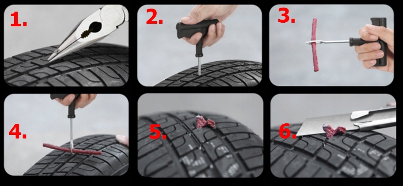 Набор хорошо справится с проколами протектора передней шины, боковые проколы он не отремонтирует, также следует не забыть иметь насос для накачивания залатанной шины.