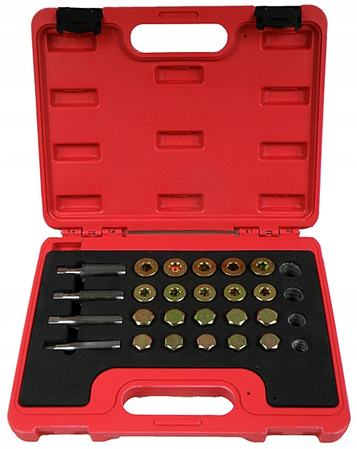 Набор для простого ремонта резьбы сливных пробок масляного поддона, коробок передач и др. Подходит для большинства резьб, обычно используемых в легковых и легких автомобилях. грузовики. Набор предназначен для автомастерских, ремонтных мастерских и сервисных центров. Весь набор помещается в прочный практичный чемодан для удобной транспортировки и хранения.