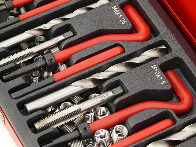 Набор предназначен для ремонта поврежденной резьбы в двигателях и других узлах автомобиля. Сверла и метчики изготовлены из быстрорежущей стали HSS4341.