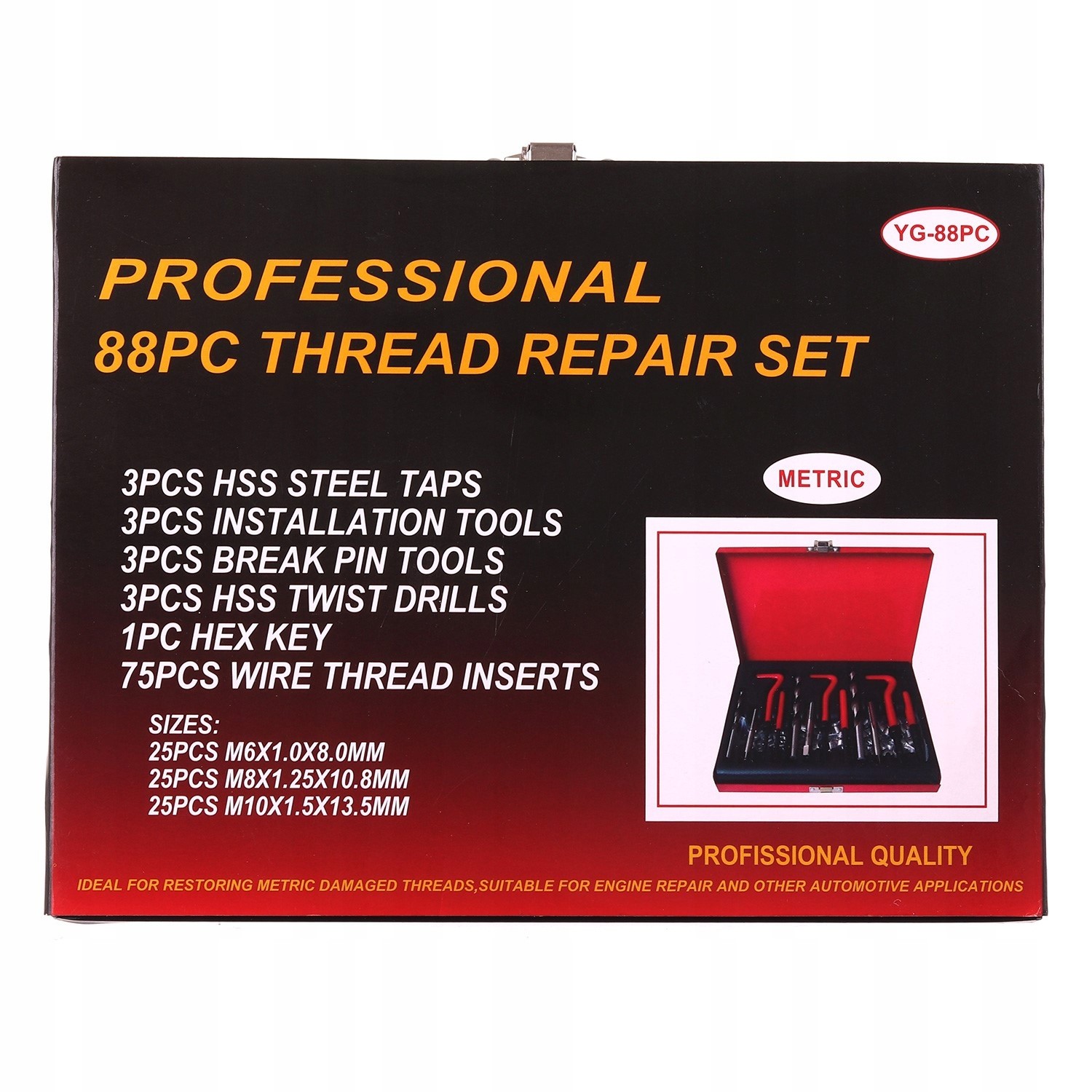 Профессиональный набор для ремонта резьбы. Сверла и метчики изготовлены из быстрорежущей стали HSS4341. Одноступенчатые метчики нарезают резьбу, в которую вставляется спиральная вставка из твердой нержавеющей стали. Вставка вставляется с помощью направляющей ручки и пробойника, который ломает выступающий кончик вставки.