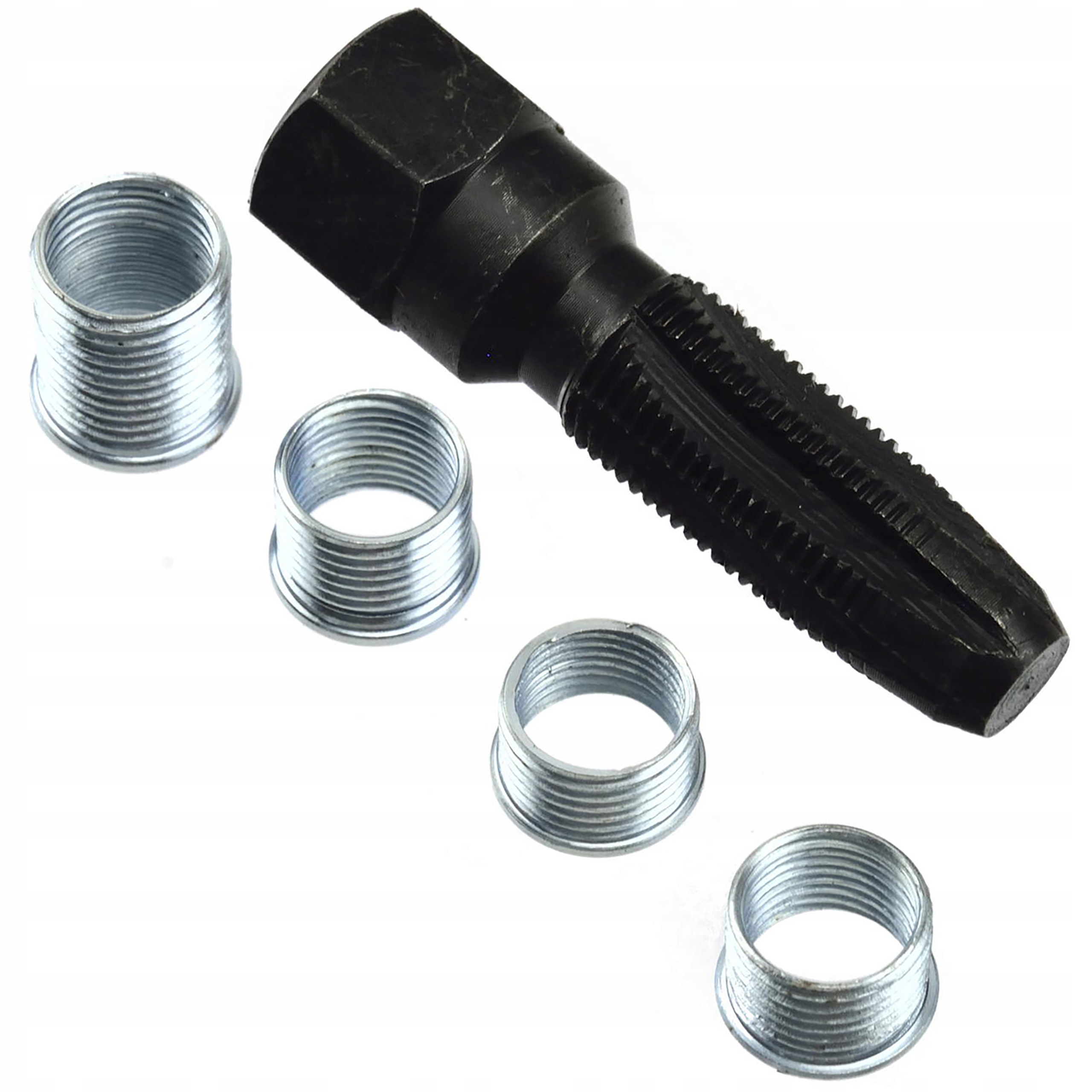 Комплект для ремонта резьбы свечей зажигания. Набор предназначен для регенерации резьбы свечей зажигания. С помощью этого инструмента вы сможете сделать это быстро и профессионально. Зенкуем резьбу черным метчиком, затем вкручиваем убавки и готово. В редуктор подходят стандартные свечи зажигания.