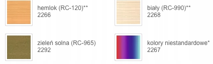 Доступные цвета: сосна/лиственница, тик, каштан, темно-зеленый, красное дерево, палисандр, бесцветный, орех, сосна, деревенский дуб, светлый дуб, болиголов, белый, черное дерево, зеленая соль, серебристо-серый, графит, платина, антрацит, водянисто-серый.