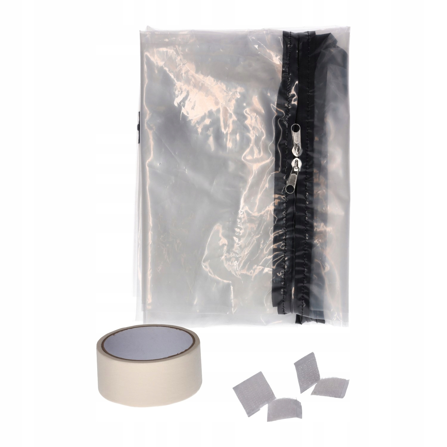 Штора изготовлена из прозрачной фольги LDPE (полиэтилена) с высокой механической прочностью и устойчивость к факторам, возникающим во время ремонтных работ, таким как: пыль, вода, краски и запахи.