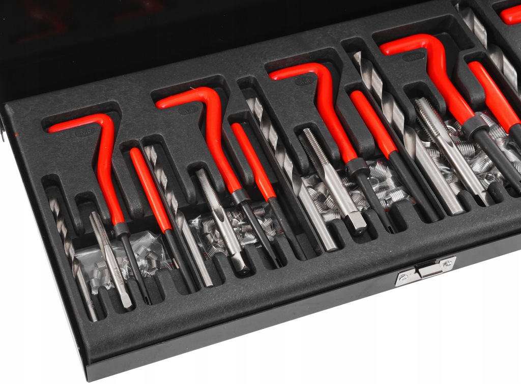 Высококачественный набор для ремонта резьбы, позволяющий заменить поврежденную резьбу новой резьбовой вставкой. Сверла и метчики изготовлены из быстрорежущей стали HSS. Одноступенчатые метчики нарезают резьбу, в которую вставляется спиральная вставка из твердой нержавеющей стали. Вставка вставляется с помощью направляющей ручки и пробойника, который ломает выступающий кончик вставки.