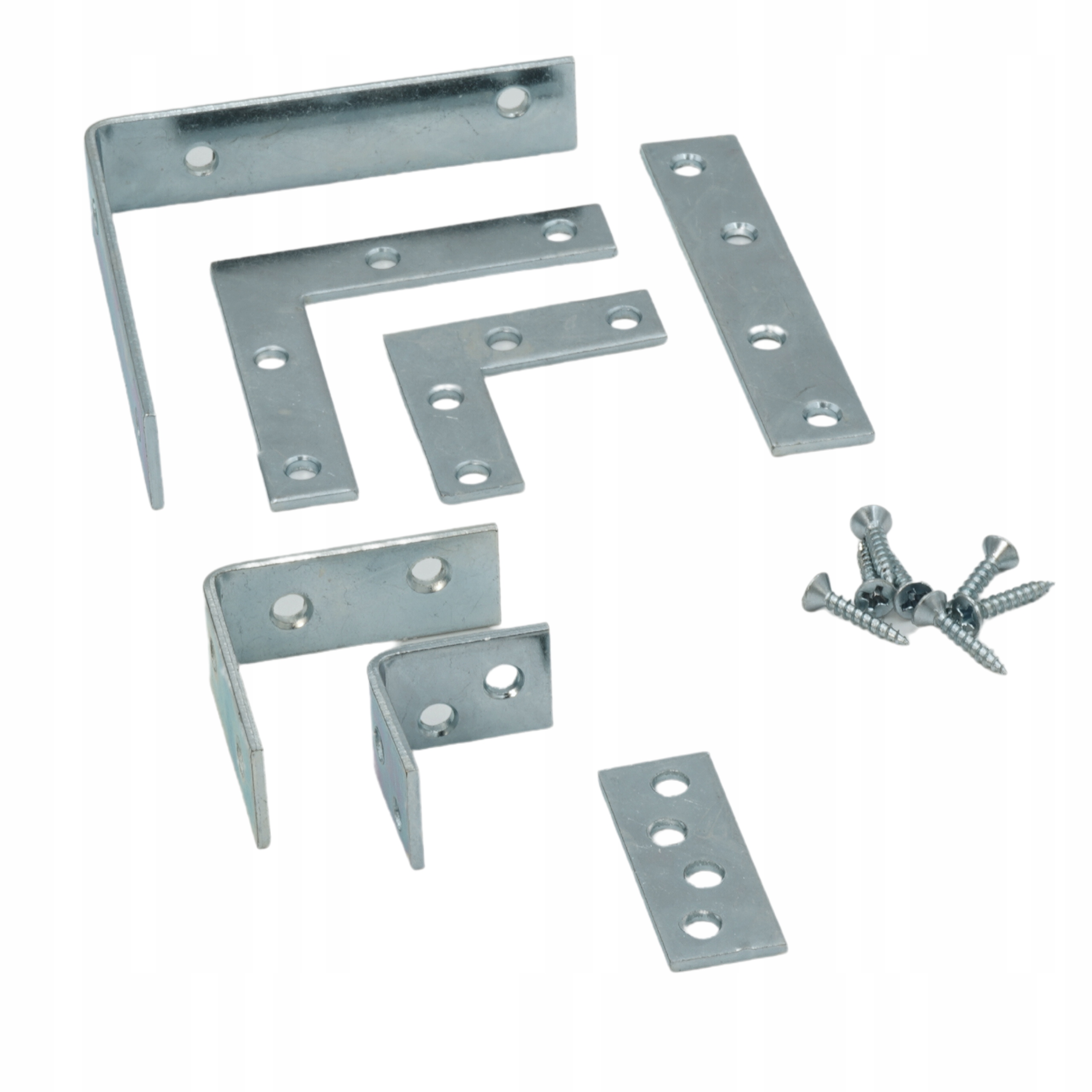 Практичный набор, состоящий из угловых кронштейнов и соединительных пластин разных размеров. Подходит для различных мебельных конструкций. Ручки мебели и стульев обеспечивают устойчивое соединение при сборке мебели, стульев, столов или полок. Плоский соединитель для крепления деревянных элементов, таких как доски или брус.