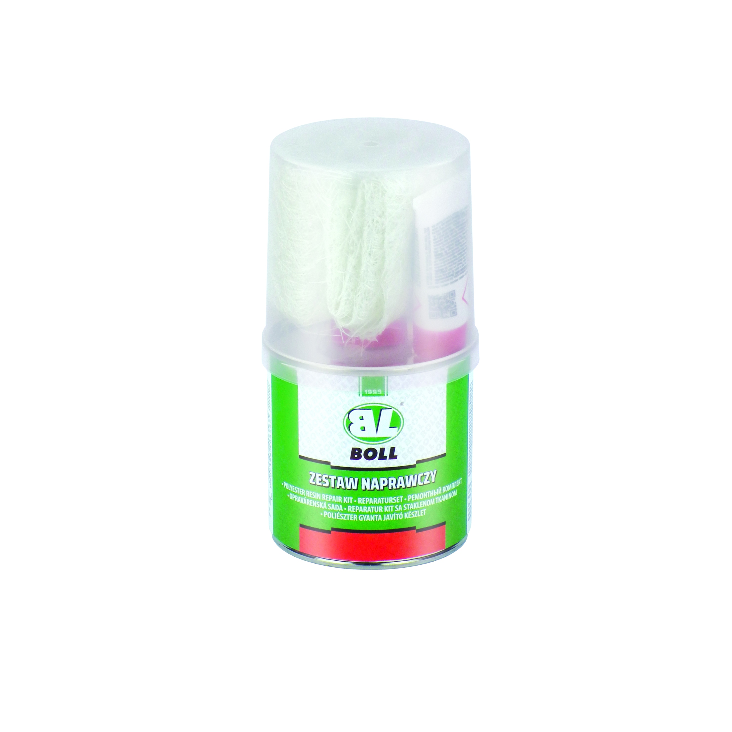Ремкомплект BOLL состоит из полиэфирной смолы (242 г), отвердителя (8 г) и стекломата (0,25 м2). Применяется как для восполнения значительных потерь материала в кузовах автомобилей, лодок, прицепов и т.п., так и для усиления и придания жесткости конструкции ремонтируемых элементов. Смола имеет очень хорошую адгезию к металлу, пластиковым поверхностям, стали, стеклу, дереву и бетону. Он устойчив к температуре до 80°C, погодным условиям, бензину, жиру, маслу, разбавленным кислотам и щелочам. Характеризуется высокой эластичностью и коротким временем затвердевания. После затвердевания имеет очень высокую механическую прочность, можно шлифовать и покрывать любой полиэфирной шпаклевкой.