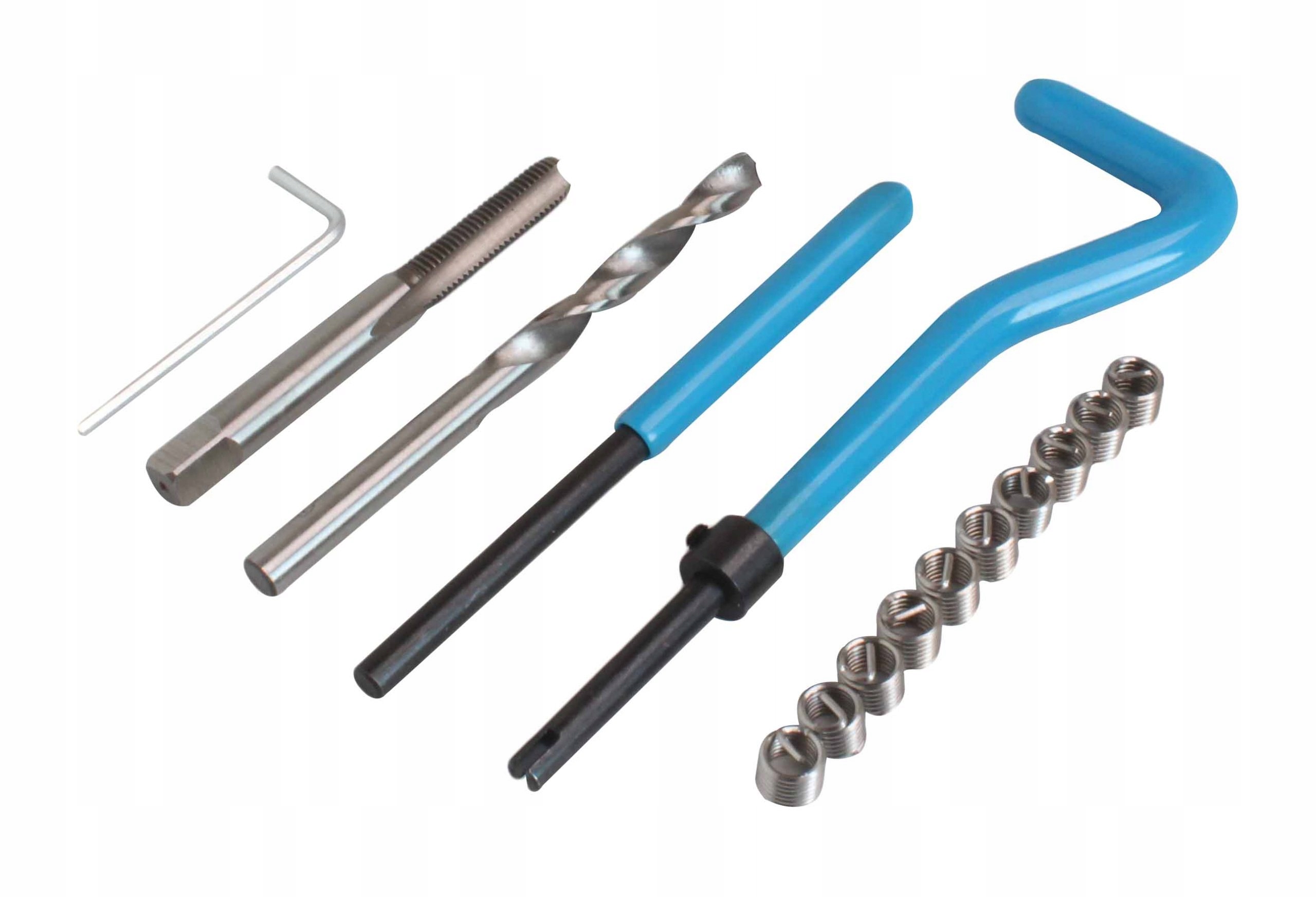 Набор для ремонта поврежденной резьбы в двигателях и других узлов автомобиля. Сверла и метчики изготовлены из быстрорежущей стали HSS. Одноступенчатые метчики нарезают резьбу, в которую вставляется спиральная вставка из твердой нержавеющей стали. Для вставки вставки имеется направляющая ручка и пробойник, который ломает выступающий кончик вставки.
