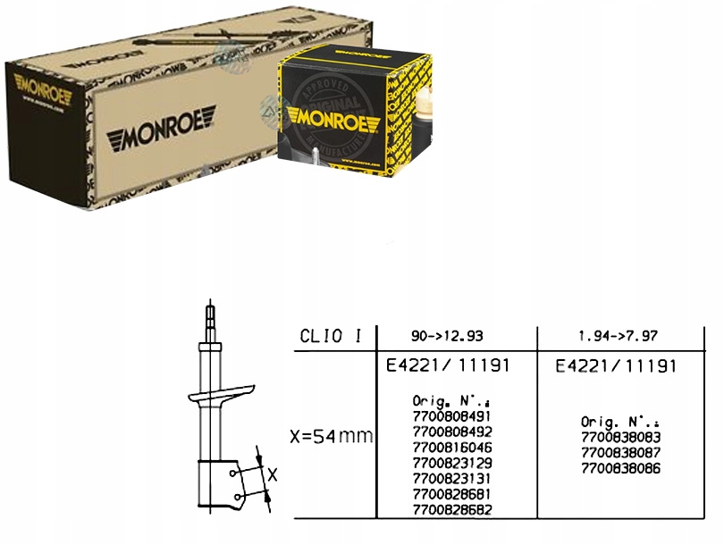 Front Shock Absoolber L/P Renault Clio I 1.2-1.9d 05.90-09.98 -это продукт производителя, чьи части мы устанавливаем каждый день на нашем веб-сайте , в автомобилях наших клиентов наших клиентов в течение многих лет , мы знаем, что работает , и это показывает удовлетворение наших клиентов. Мы сосредоточены на безопасности , поэтому вы можете быть уверены, что продукты бренда Monroe в оригинале 100%! Благодаря нашему опыту, мы можем установить продукты на нашем сайте, которые вы покупаете для своего автомобиля.