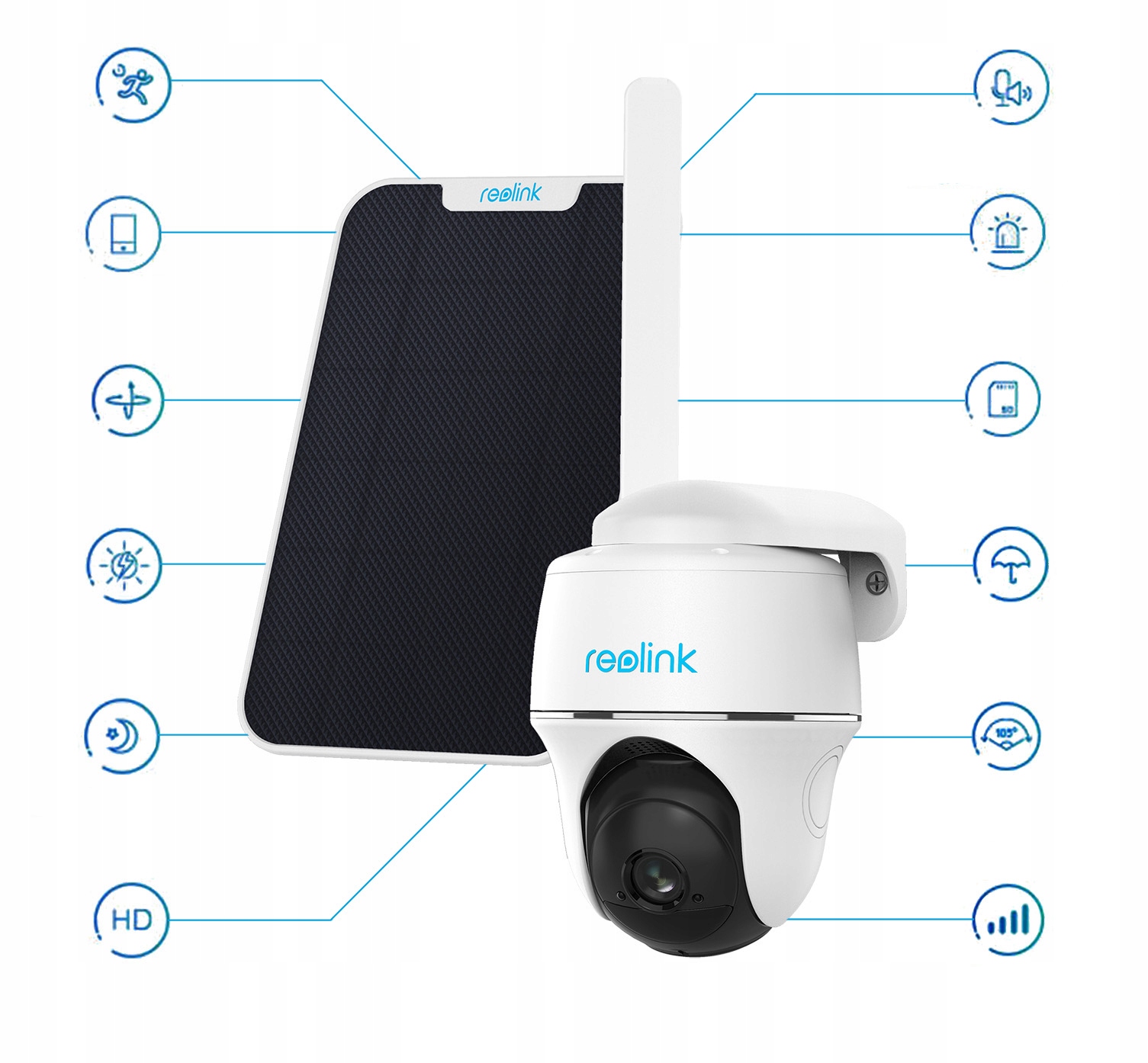Беспроводная камера Reolink GO PT представляет собой вращающуюся модель камеры FullHD с солнечной панелью, аккумулятором и встроенным двунаправленным микрофоном с возможностью записи на карту microSD емкостью 64 ГБ (в комплект входит 16 ГБ).