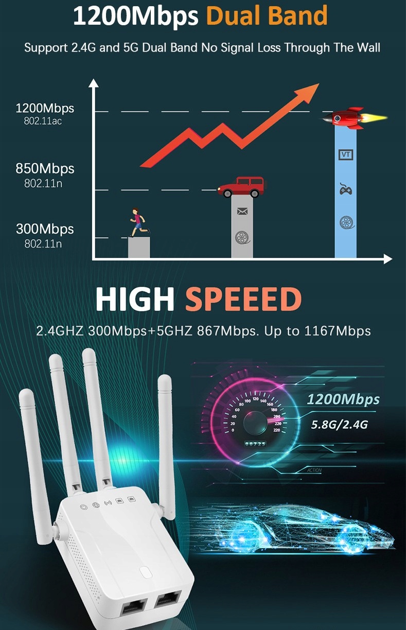 SST-WR122DN — это релейный усилитель сигнала, использующий новейшую технологию стандарта двухдиапазонной беспроводной сети WIFI 11AC; ретранслятор может искать сетевые сигналы одновременно в диапазонах частот 2,4G и 5G, а максимальная скорость передачи составляет 1200 Мбит/с (2,4G/300 Мбит/с и 5G/867 Мбит/с); Используйте канал 5 ГГц для передачи данных с низким уровнем помех и превосходной производительностью. Он позволяет пользоваться высокоскоростным Интернетом без проводов, как в проводной сети.