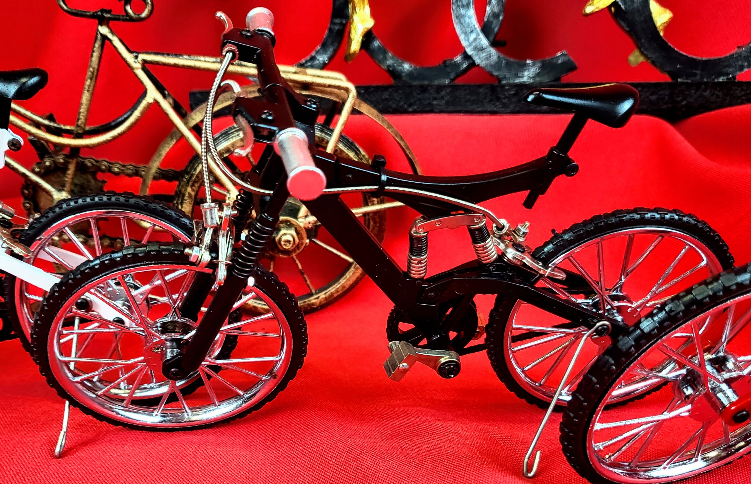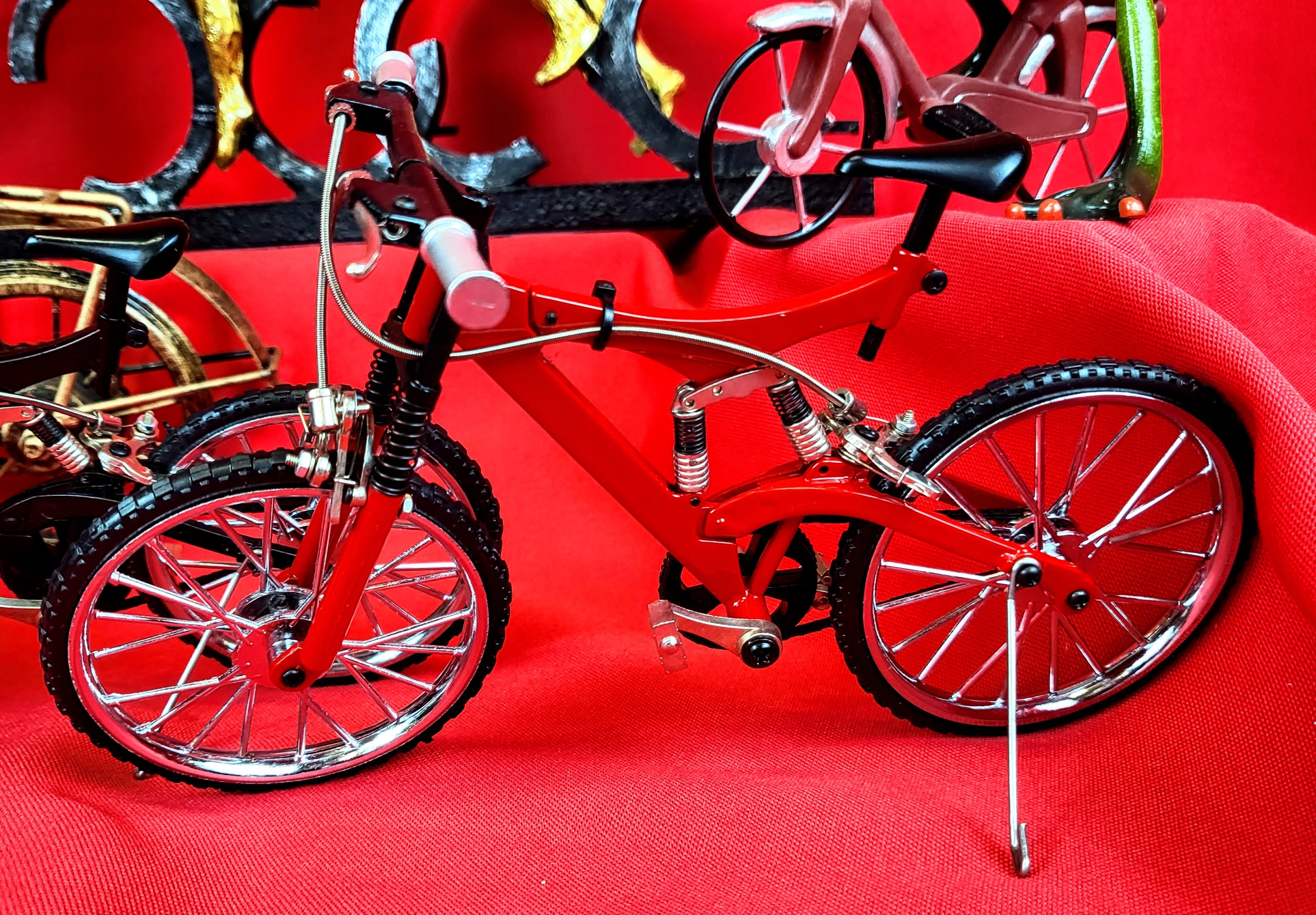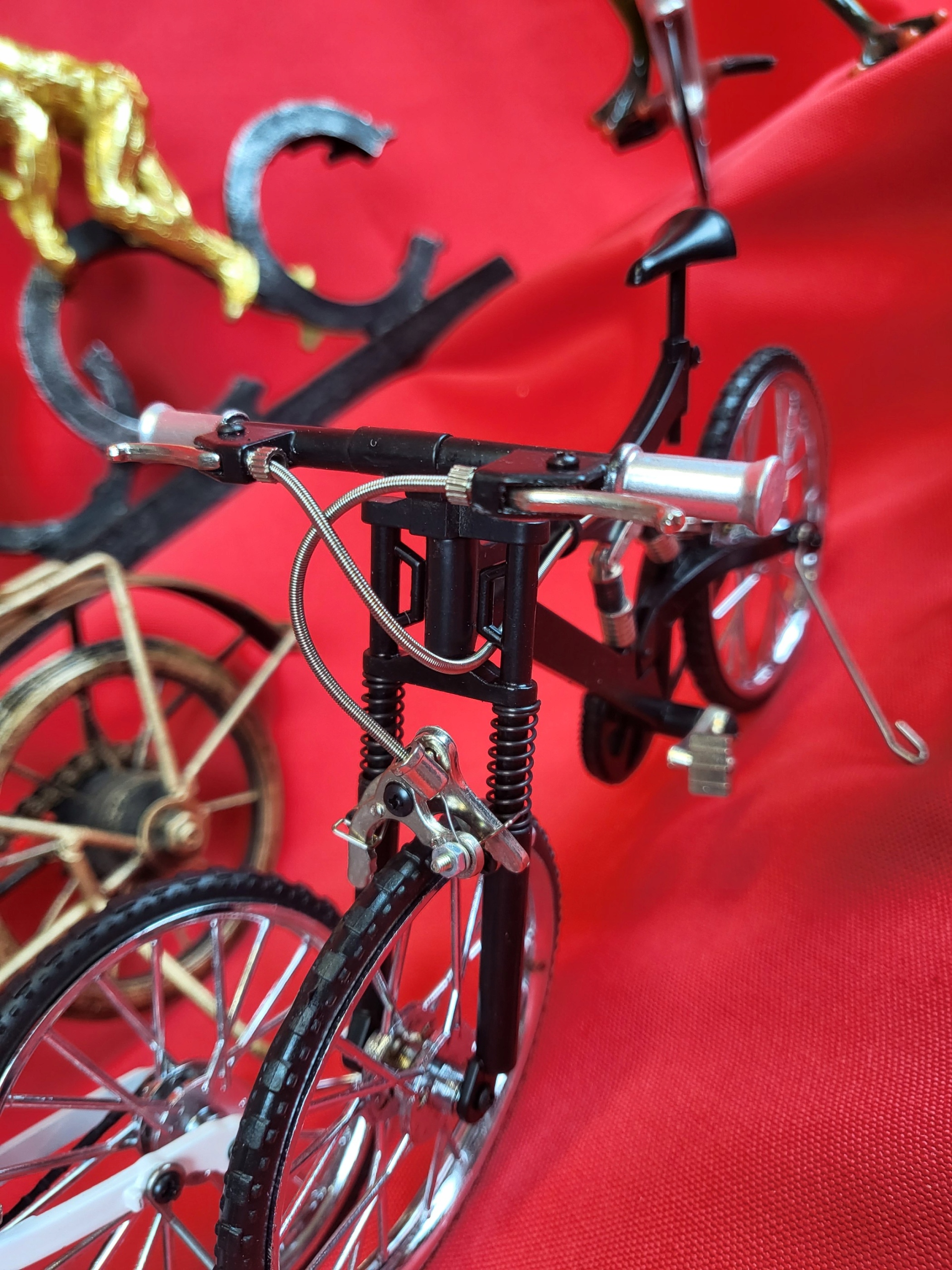Точная копия горного велосипеда, сделанная с вниманием к каждой детали. Все элементы подвижны (колеса, тормоза, амортизаторы). Идеальная идея подарка для любителя велосипедов. Это будет интересный элемент декора.