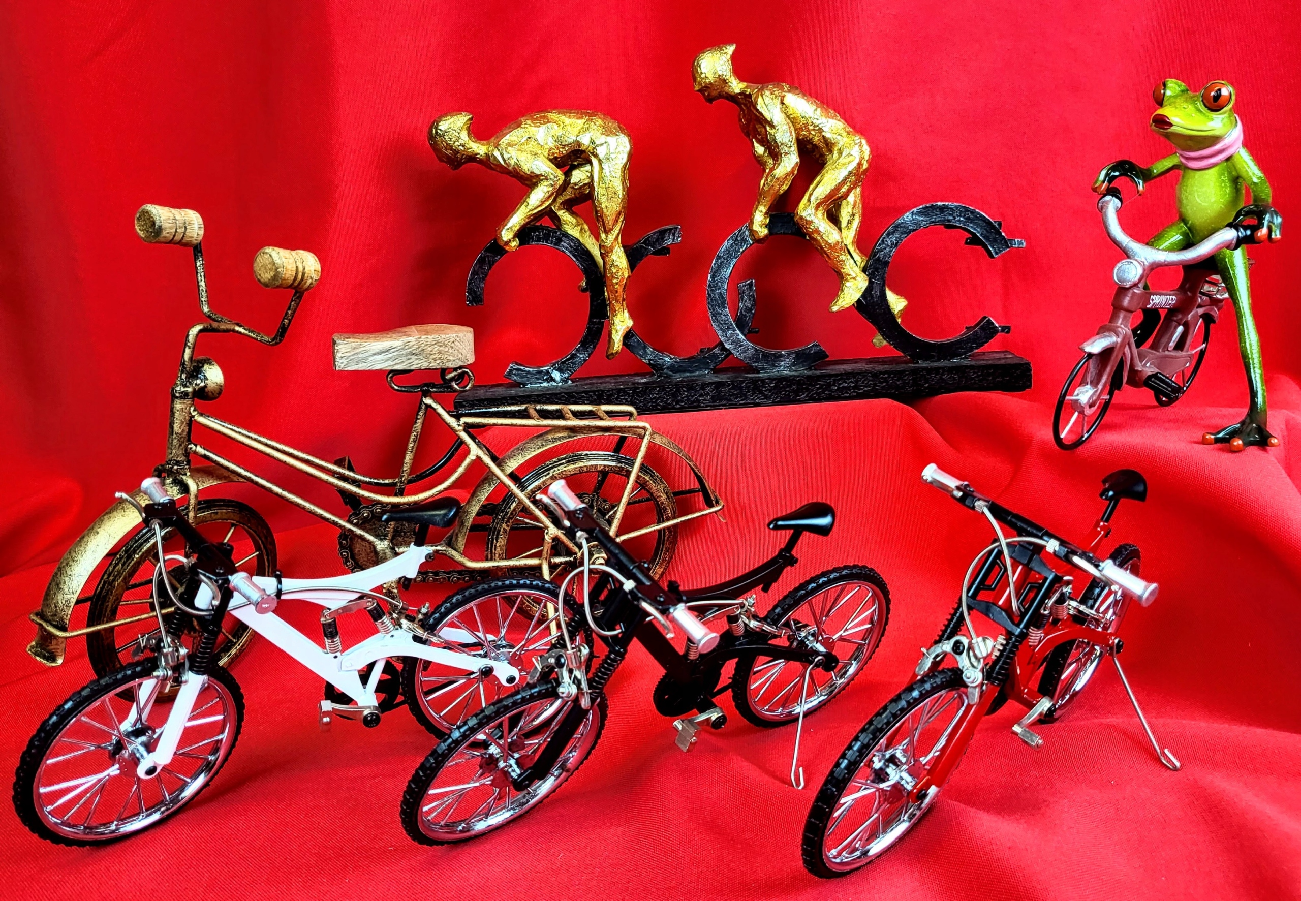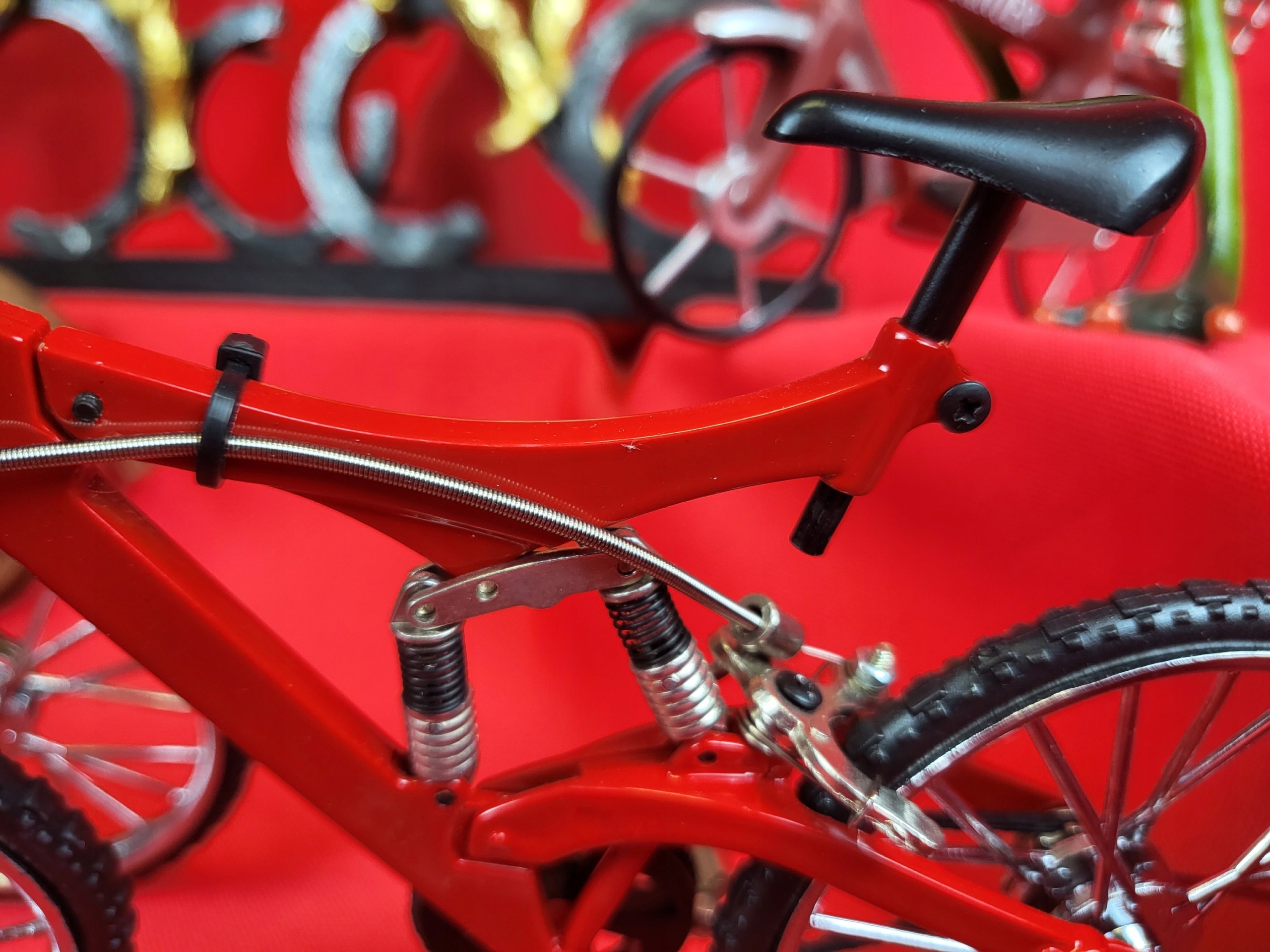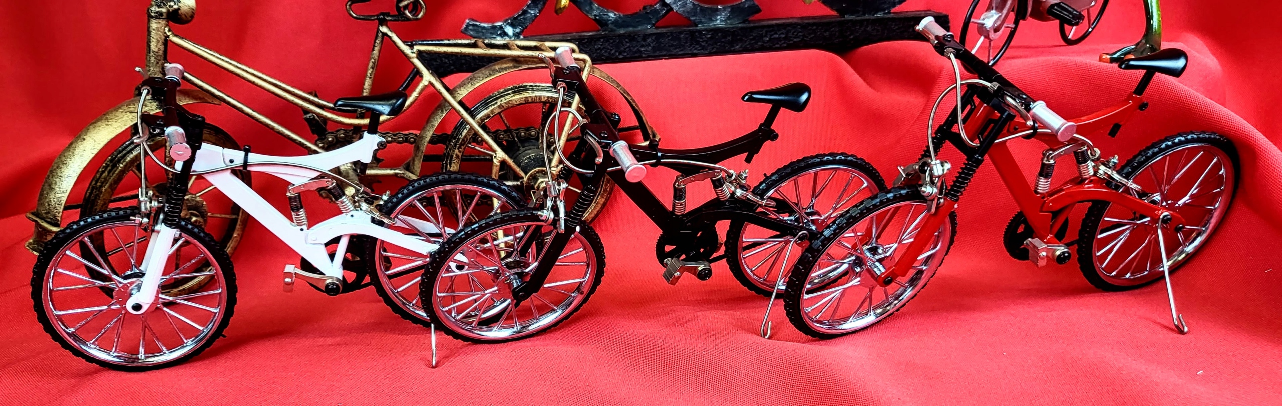 Точная копия горного велосипеда, сделанная с вниманием к каждой детали. Все элементы подвижны (колеса, тормоза, амортизаторы). Идеальная идея подарка для любителя велосипедов. Это будет интересный элемент декора.