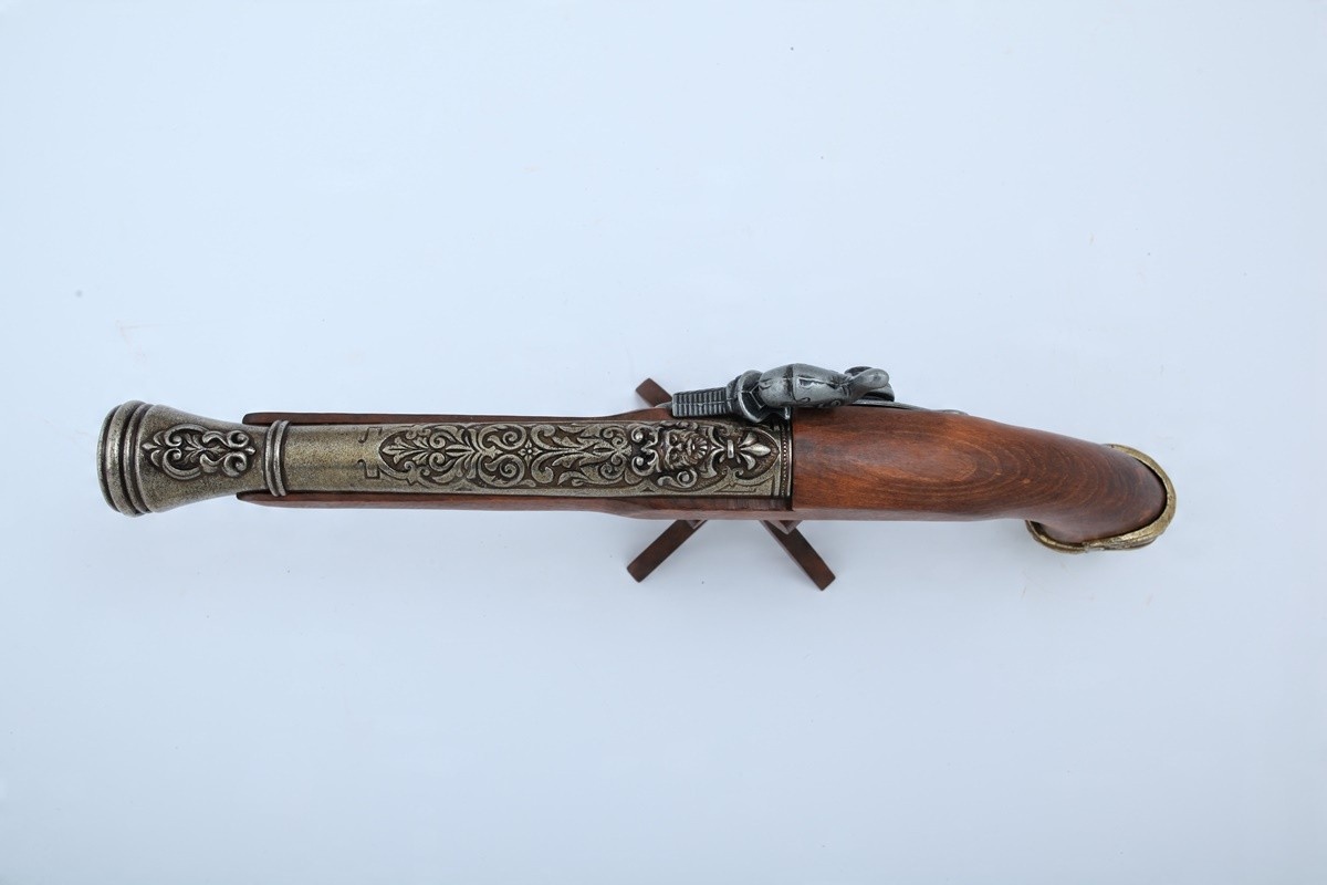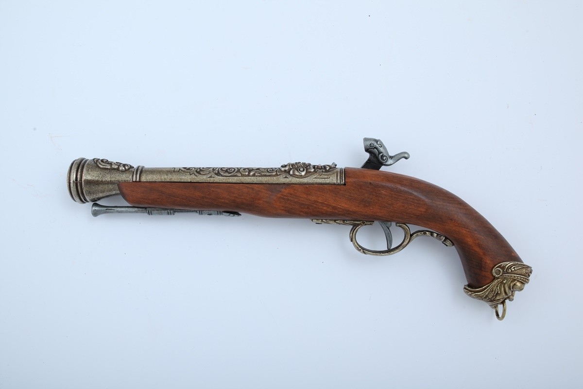Точная копия итальянского кремневого пистолета XVIII века.Красиво инкрустированный ствол со слегка расширенным дульным срезом, позволяющим увеличить дальность стрельбы у оригинала. Оружие, идеальное для боя на ближней дистанции. Он привлекает внимание замысловатым спусковым механизмом и орнаментом на конце рукоятки. Спусковой механизм можно отвести назад и произвести выстрел всухую.