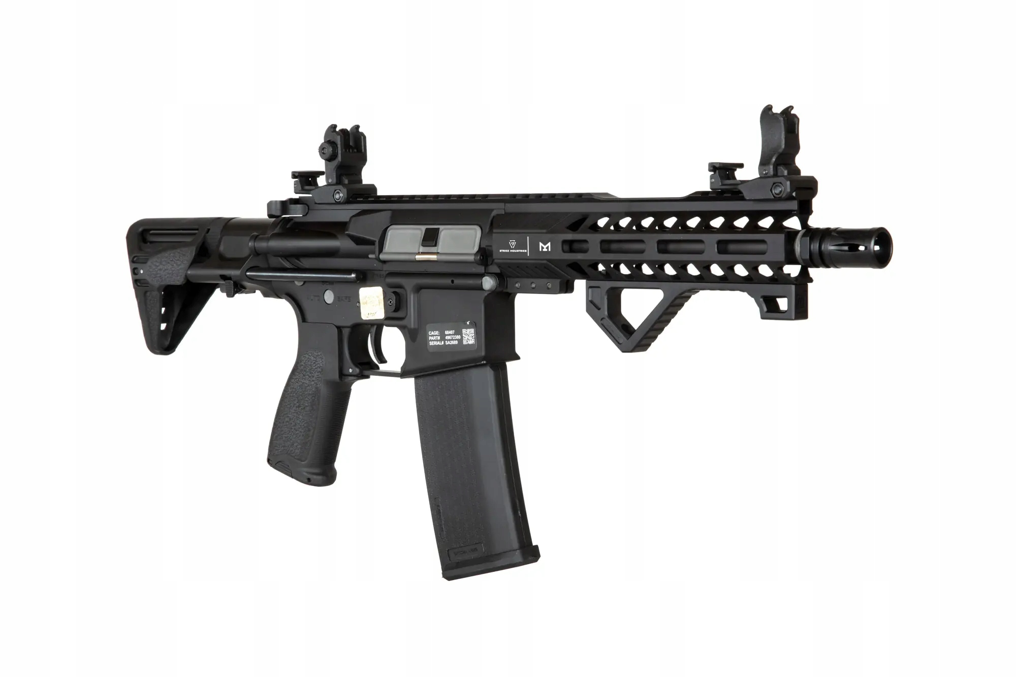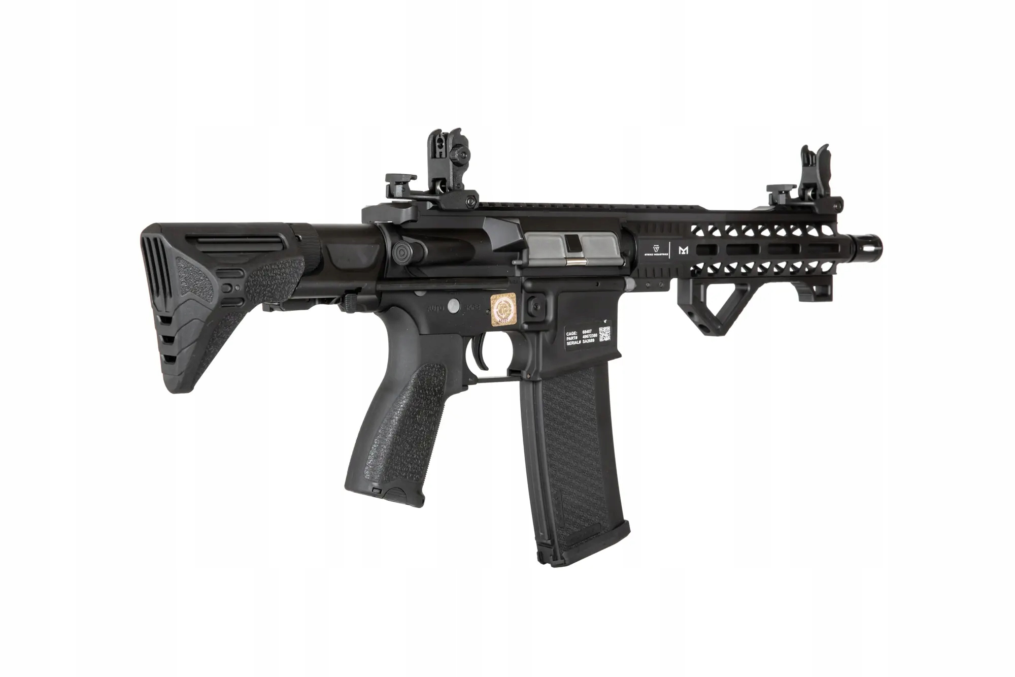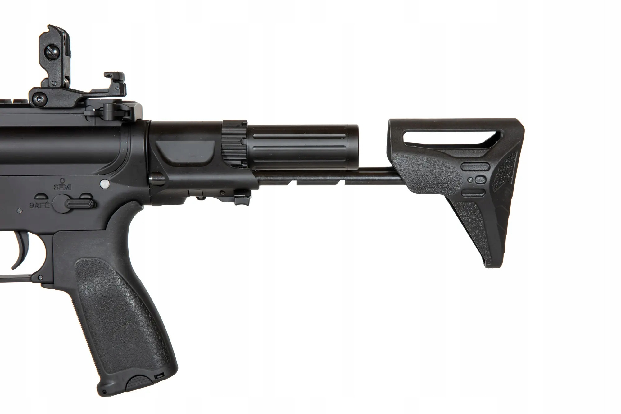 Реплика Карабин SA-E17 оснащен передней планкой в системе крепления M-LOK, изготовленной по лицензии компании Strike Industries. Под планкой установлена удобная угловая тактическая рукоятка, облегчающая эксплуатацию реплики. Ствол заканчивается стандартным дульным устройством. На верхней RIS-рейке установлены складные прицельные приспособления.