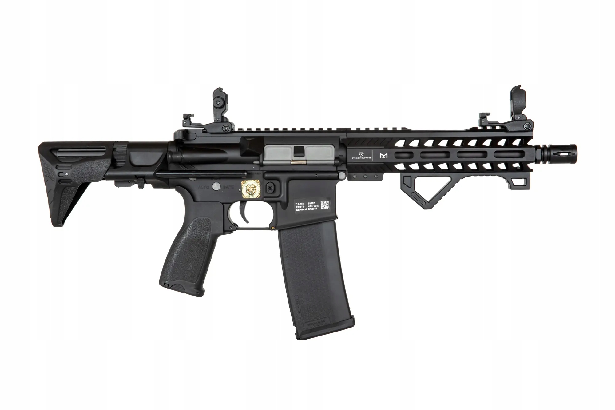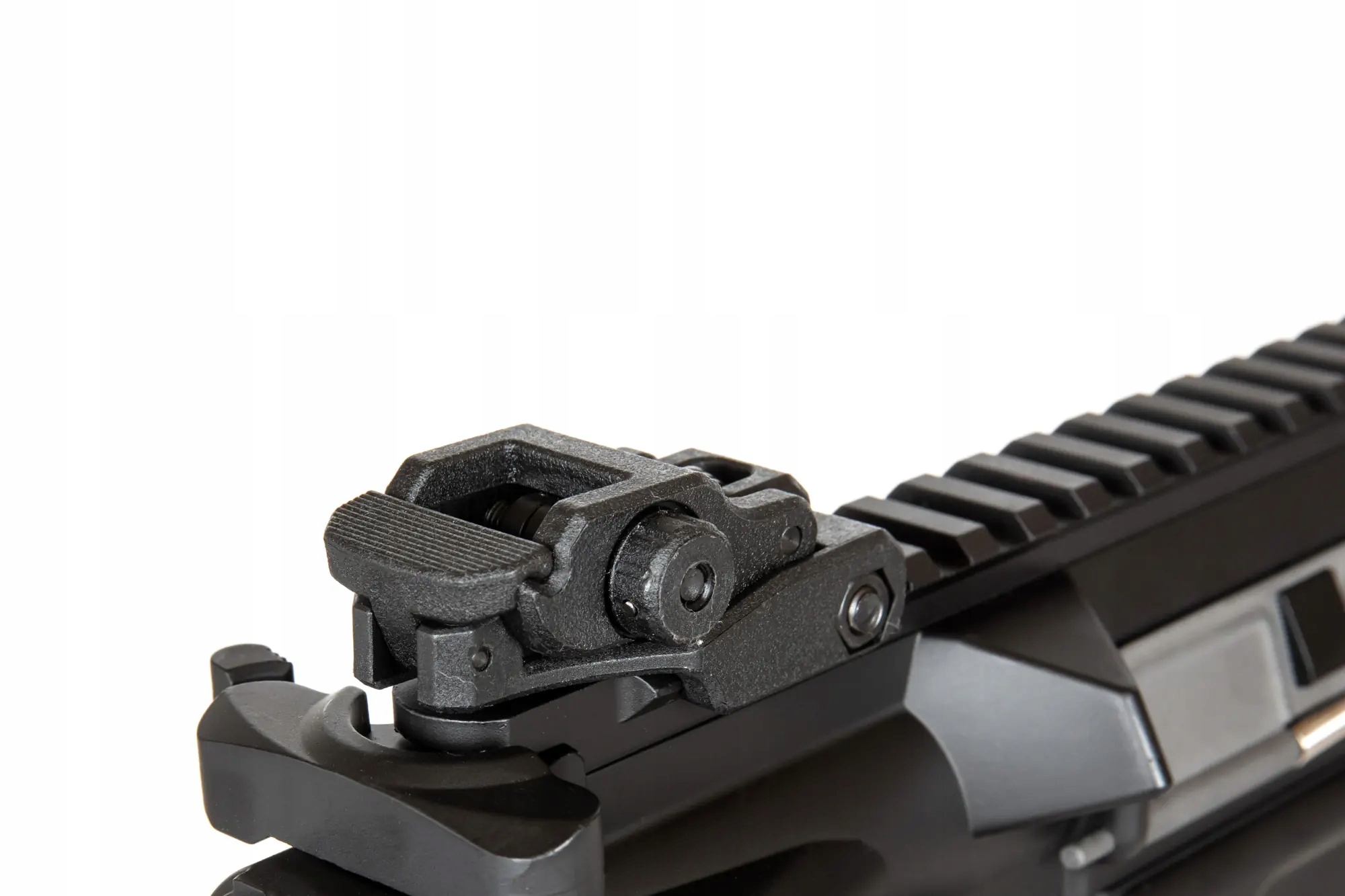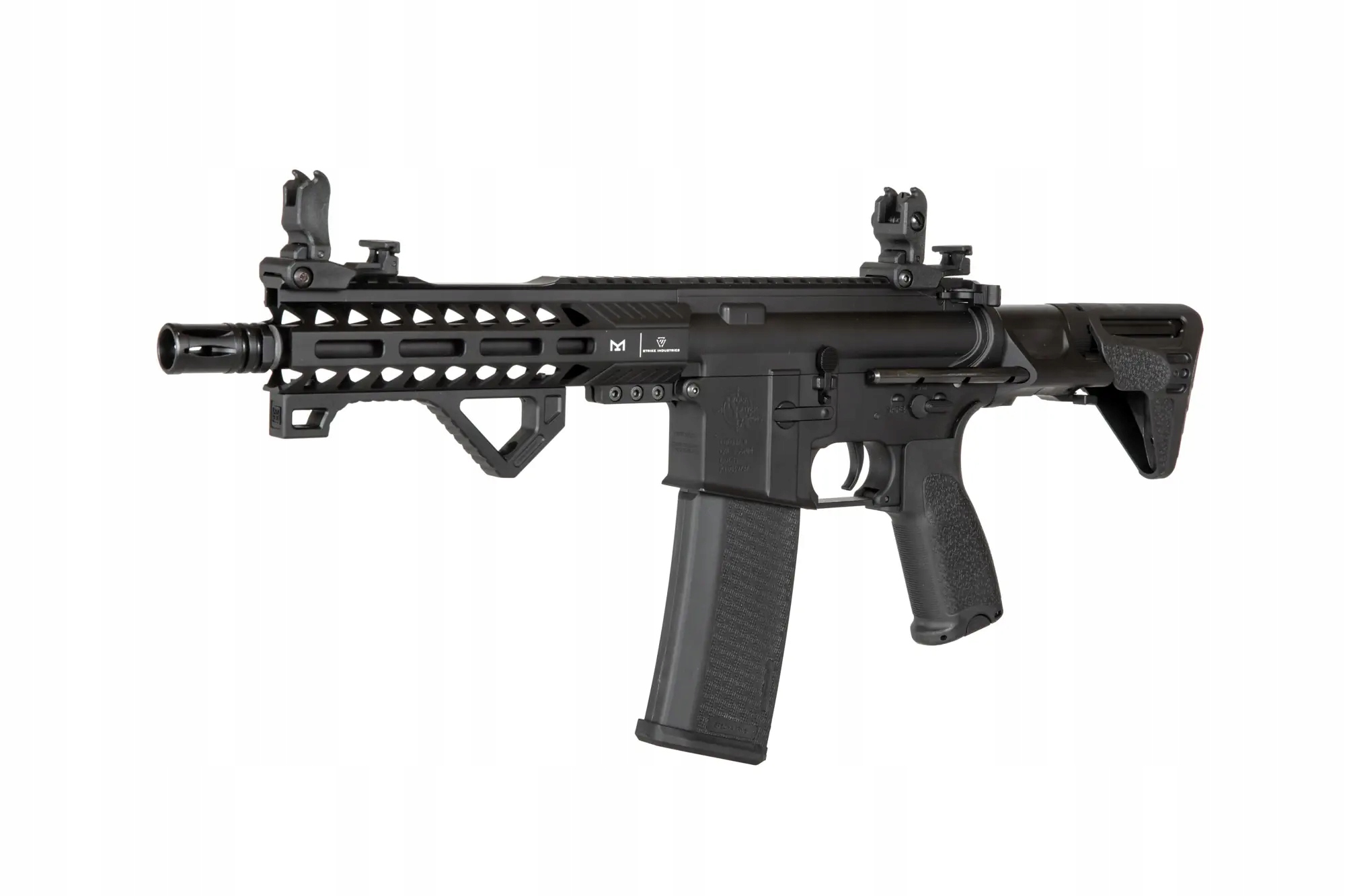 Реплика Карабин SA-E17 оснащен передней планкой в системе крепления M-LOK, изготовленной по лицензии компании Strike Industries. Под планкой установлена удобная угловая тактическая рукоятка, облегчающая эксплуатацию реплики. Ствол заканчивается стандартным дульным устройством. На верхней RIS-рейке установлены складные прицельные приспособления.