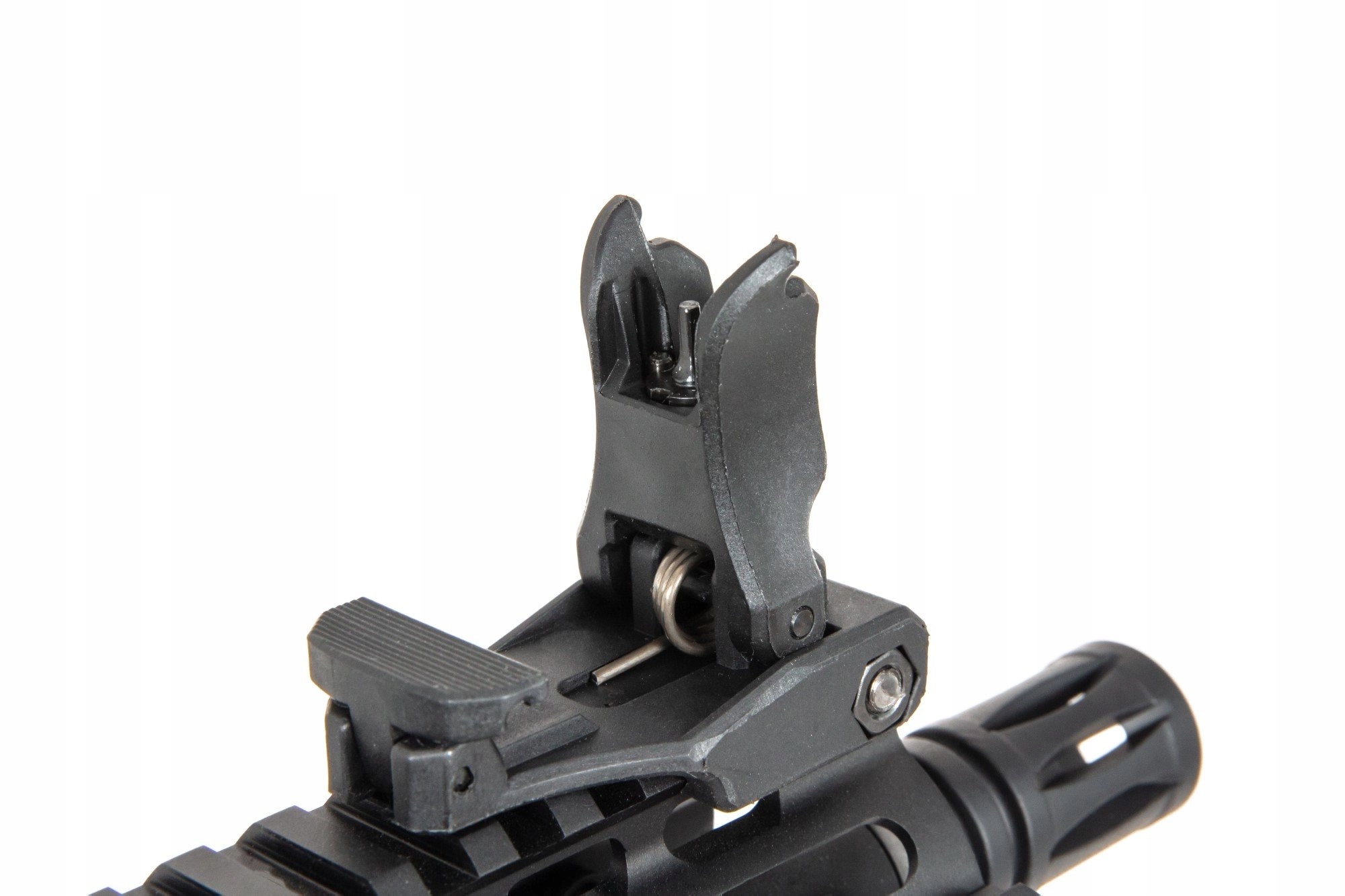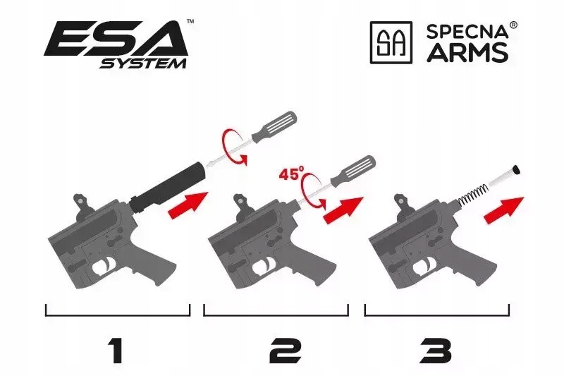В реплике используется система быстрой замены пружин ESA. Это позволяет быстро и эффективно отрегулировать мощность реплики в соответствии с ожидаемыми на игровом поле условиями без необходимости иметь доступ к мастерской или ряду специализированных инструментов – достаточно открутить направляющую приклада, чтобы получить доступ к замене пружины без необходимости снимите или разберите коробку передач.