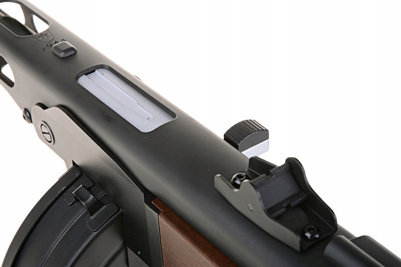 Реплика пистолета-пулемета ППШ компании «Снежный волк» изготовлена из металла и пластика. Большинство внешних металлических деталей изготовлены из стали. Это предмет вожделения любителей одного из самых характерных пистолетов-пулеметов времен Второй мировой войны. Использовалась специально разработанная коробка передач, конструкция которой основана на версии v.7 и оснащена системой быстрой замены пружин. Это позволяет легко менять характеристики реплик, адаптируя их к текущим требованиям ситуации. Реплика также оснащена работающей системой EBB, имитирующей работу замка, характерную для стрельбы из огнестрельного оружия. Этот эффект в сочетании с внешней структурой, достаточно реалистично отражающей поведение оригинала, еще больше повышает уровень реализма. Реплика имеет два режима огня: одиночный и непрерывный. Начальная начальная скорость ~340 FPS делает копию эффективным инструментом для операций на ближней и средней дистанции. Конечно, пружину можно легко поменять, быстро заменив пружину. Естественно, использовалась и система Hop-Up.
