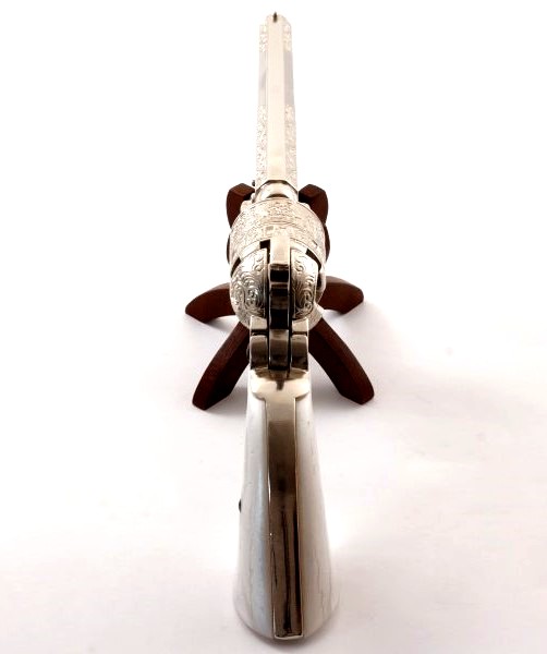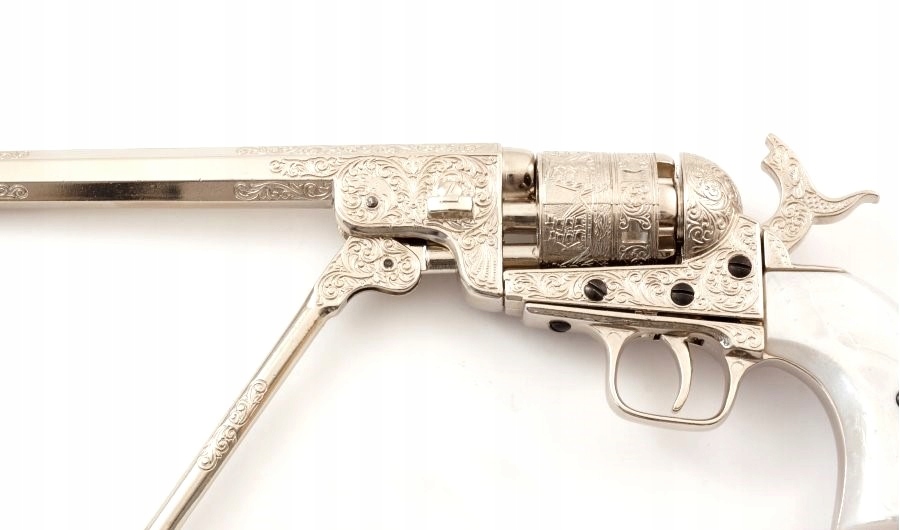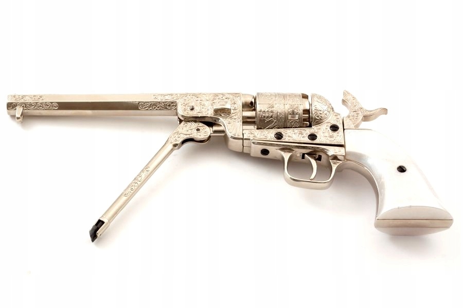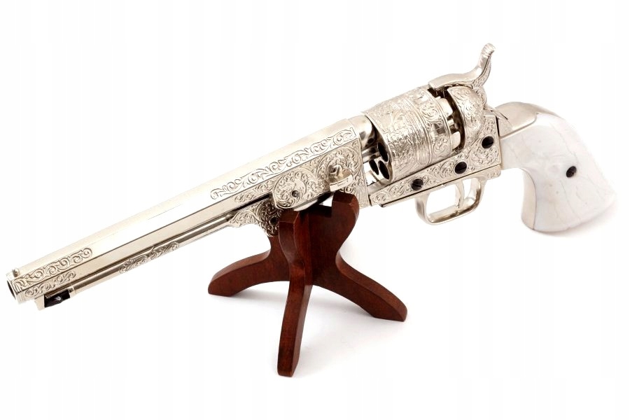 Реплика шестизащитного возврата револьвера ВМС Кольт с 1851 года. В эксклюзивной версии. Реплика сделана из остановки, законченной в хромированной версии с ручками обивки, изготовленными из имитации жемчужной массы