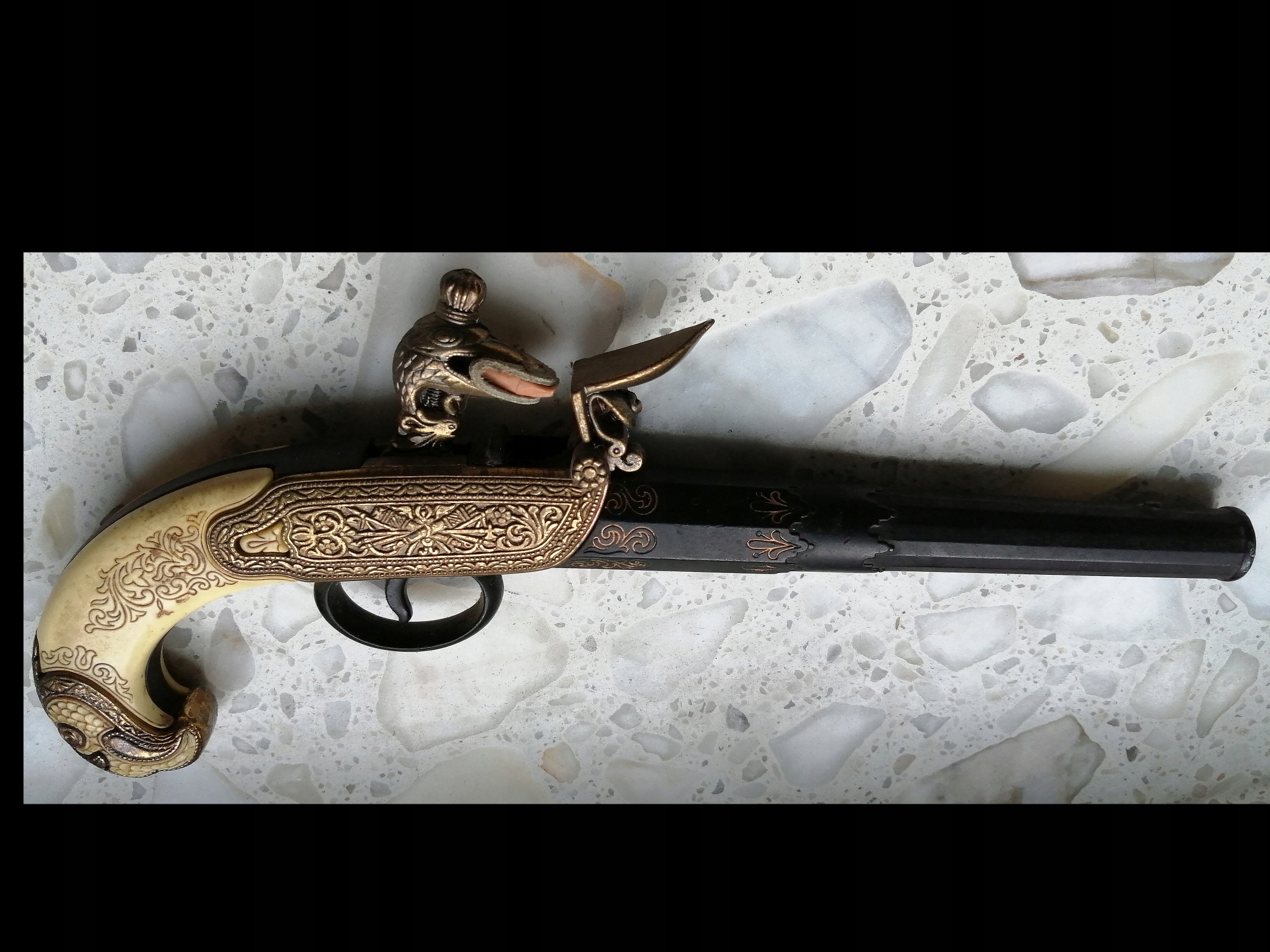Очень хорошее состояние, вероятно, реплика, я не знаю такого типа оружия, длина пистолета 28 см, диаметр ствола, изготовленный из металла и костей