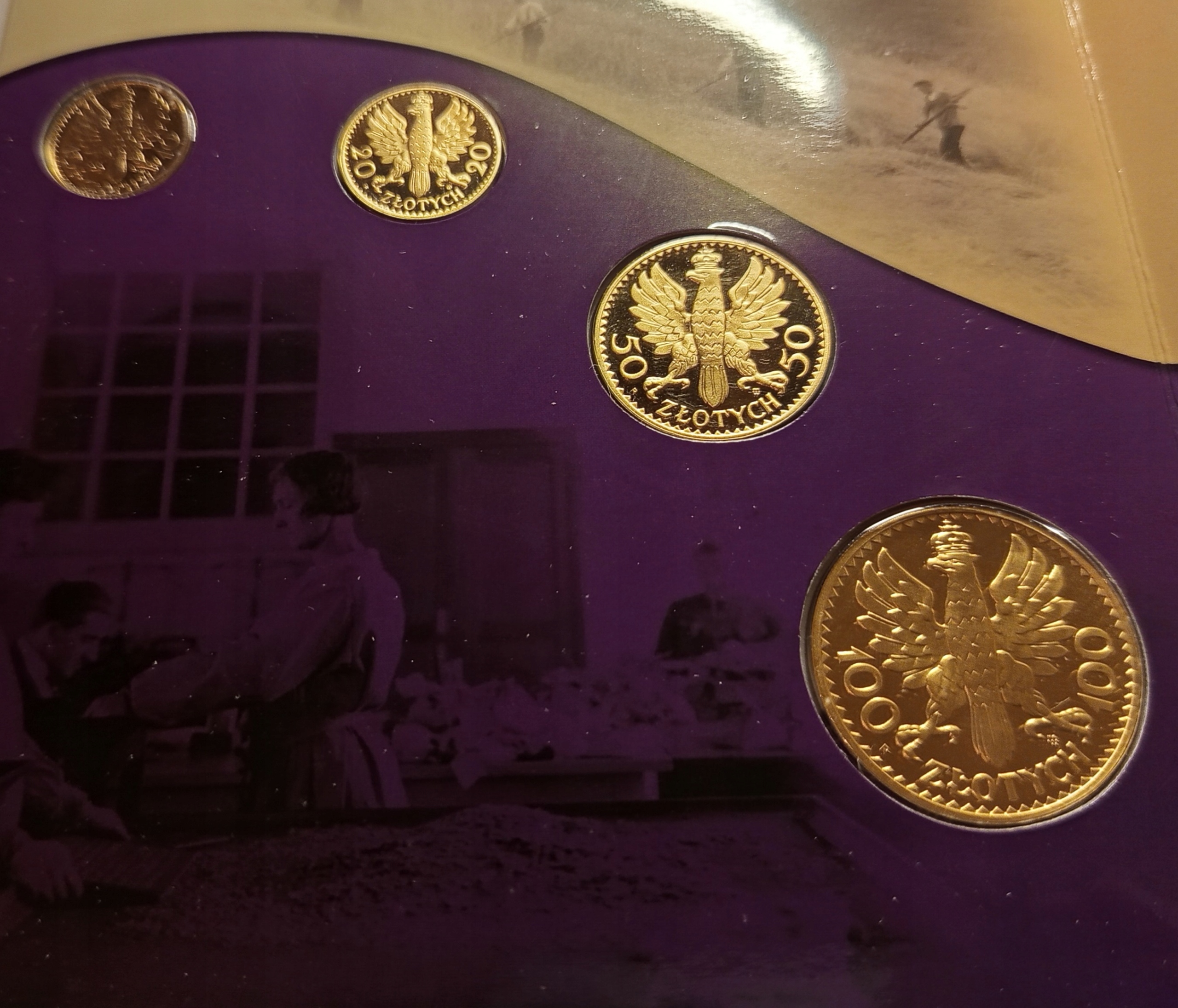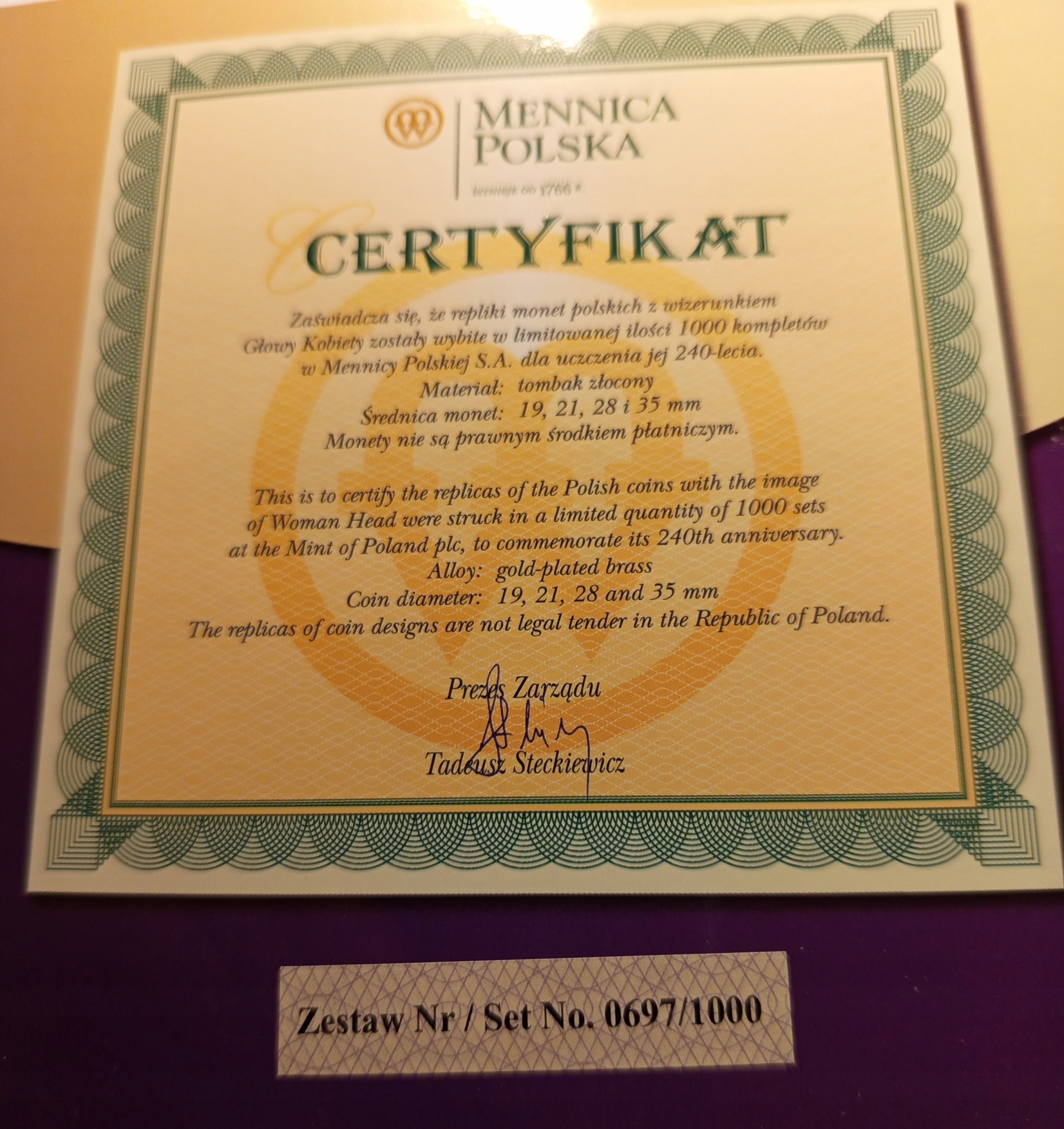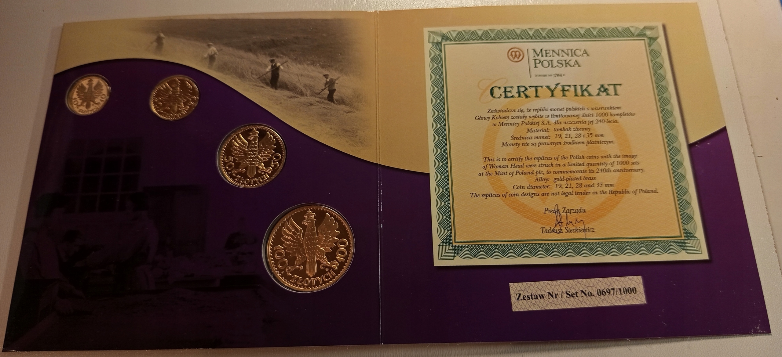 Предметом аукциона является набор, выпущенный Mennica Polska S.A. по случаю 240-летия под названием «Реплики польских монет по рисункам межвоенного периода» - «ЖЕНСКАЯ ГОЛОВА». В наборе 4 монеты: