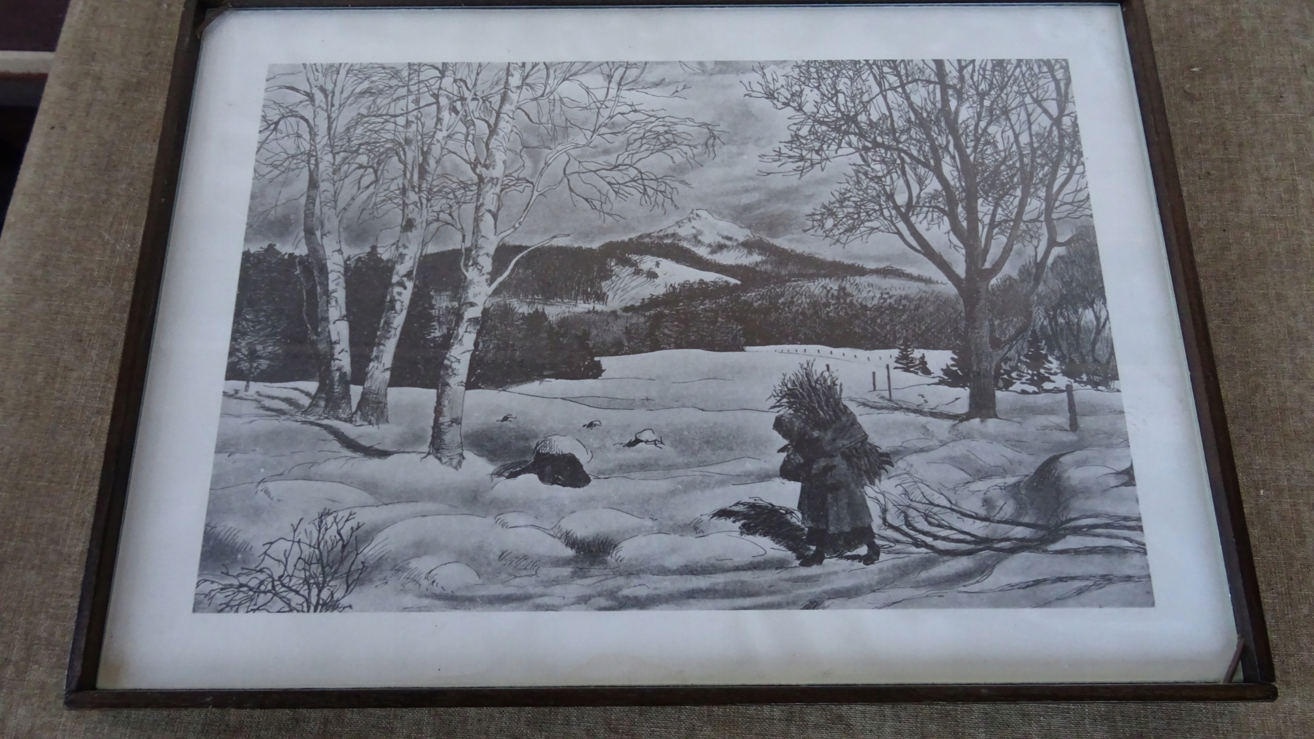 СТАРАЯ КАРТИНА, РЕПРОДУКЦИЯ С МОТИВОМ ПЕЙЗАЖА, ПРЕКРАСНО ПЕРЕДОВАН ВИД НА ГОРЫ