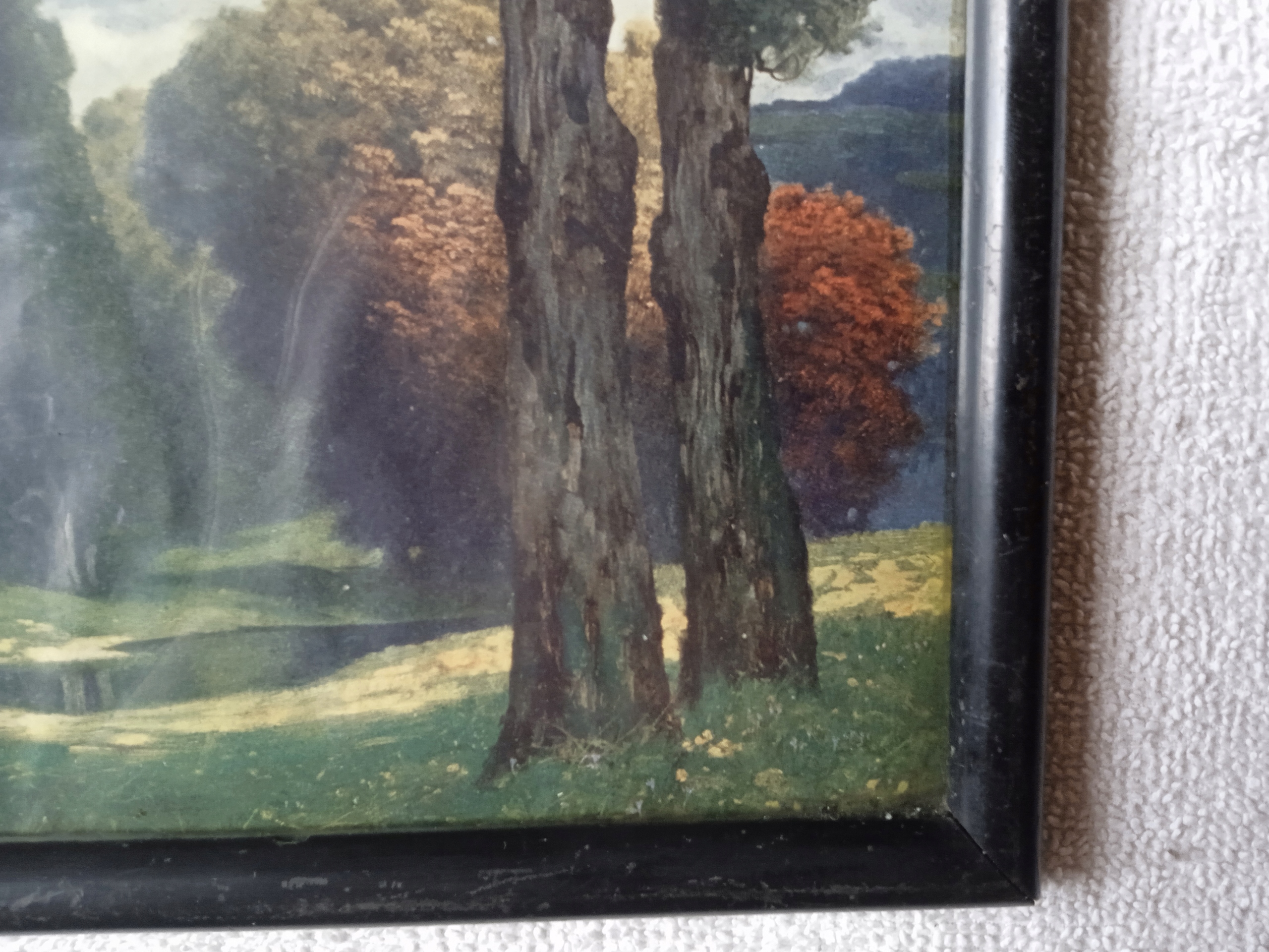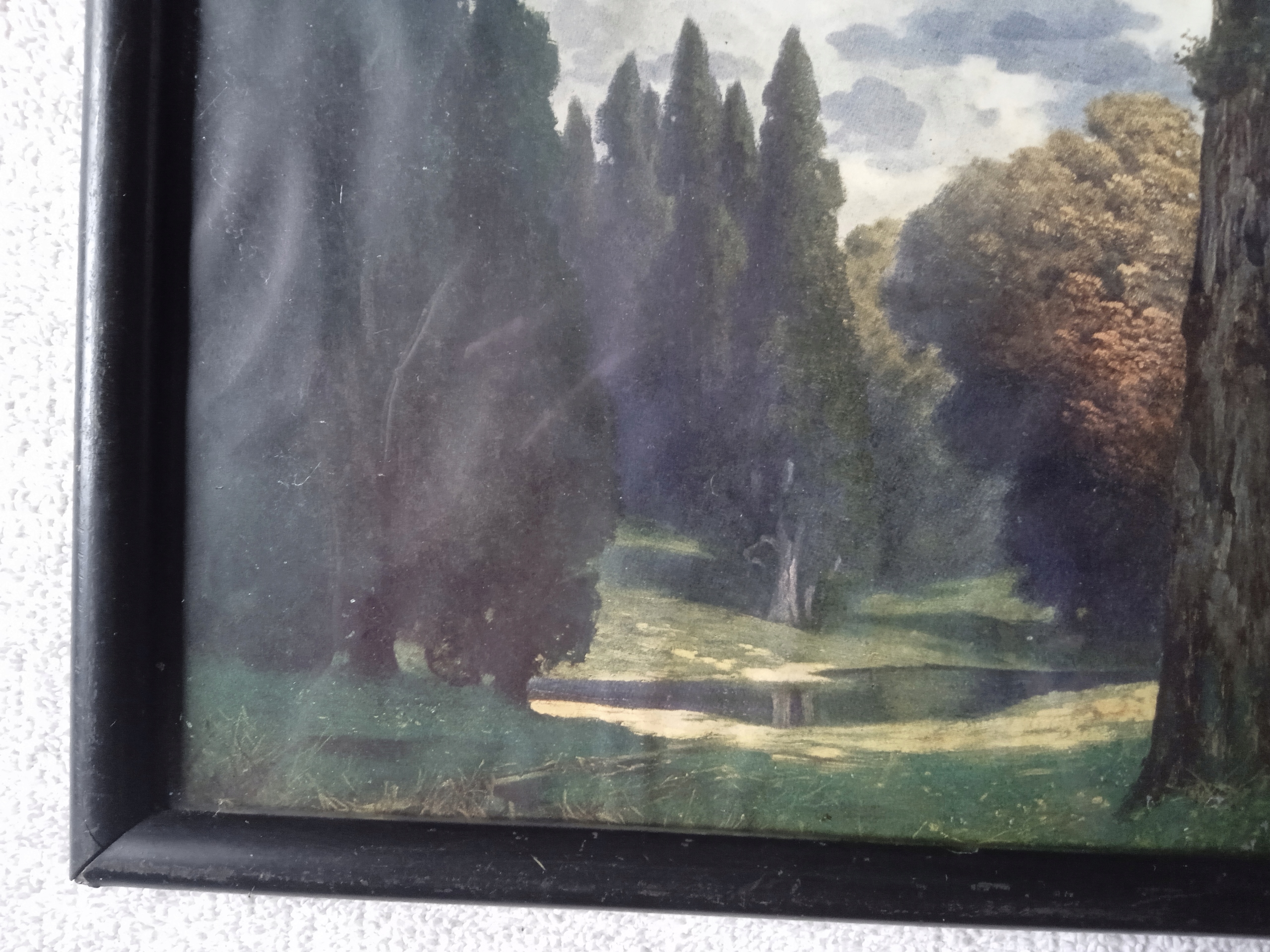 Продаю репродукцию выполненную на бумаге - пейзаж - старинный парк с прудом посередине, в сильной облачности. К сожалению, автор неизвестен. Репродукция в застекленной раме, вероятно, начала XX века. Об этом свидетельствуют использованные материалы и оригинальные крепежные гвозди. Сзади наклеена этикетка производителя, о которой я, к сожалению, не знаю. На нем есть буквы «К.Э.Х.». и под «Нет......». К сожалению, тег не заполнен. Размеры репродукции 17,3 х 24,2 см. Размеры рамки 18,8 х 25,7 см. В хорошем состоянии. В двух углах с левой стороны имеются сколы черной краски, покрывающие рамку.