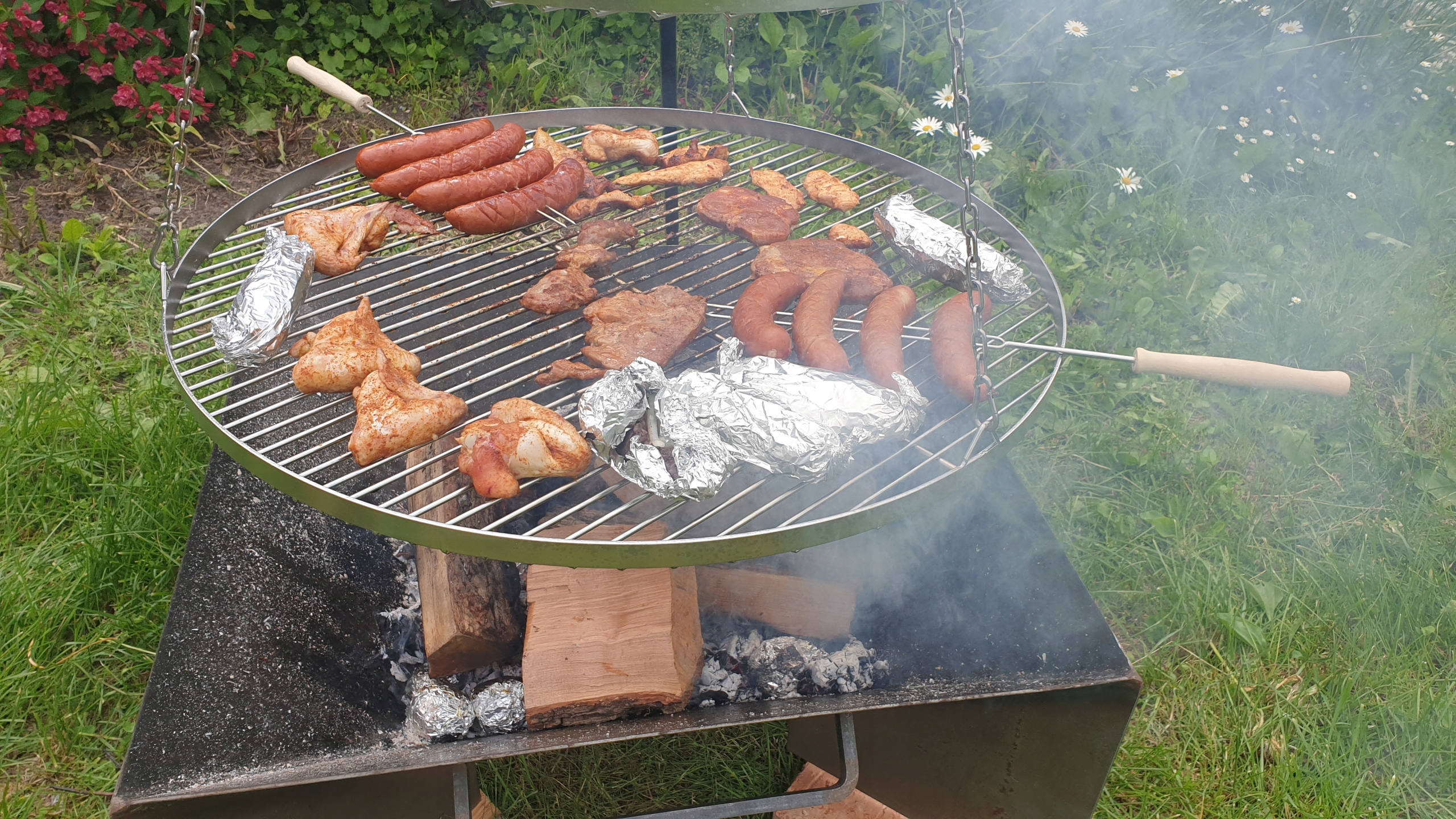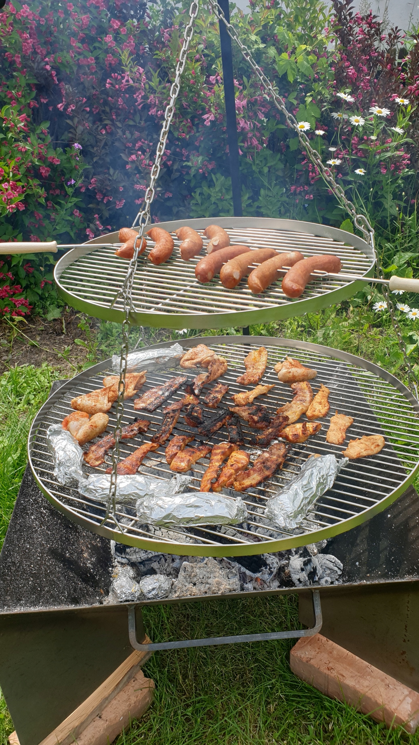 Круглую решетку из нержавеющей стали для подвешивания над камином диаметром 60 см.
