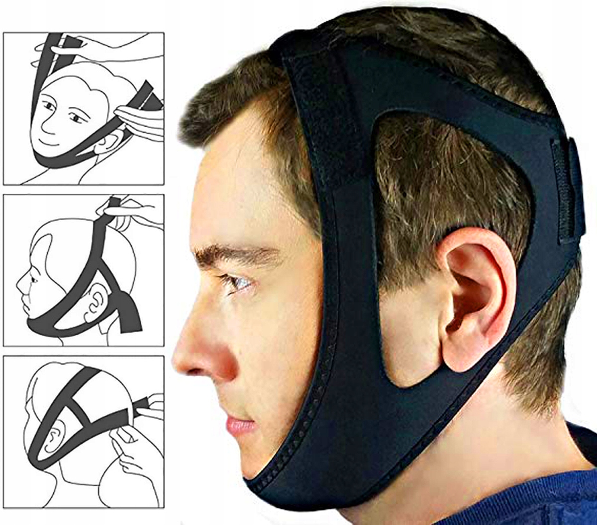 Оголовье удерживает подбородок в правильном положении, что поддерживает воздушный поток и носовое дыхание, предотвращая обструкцию дыхательных путей и храп.